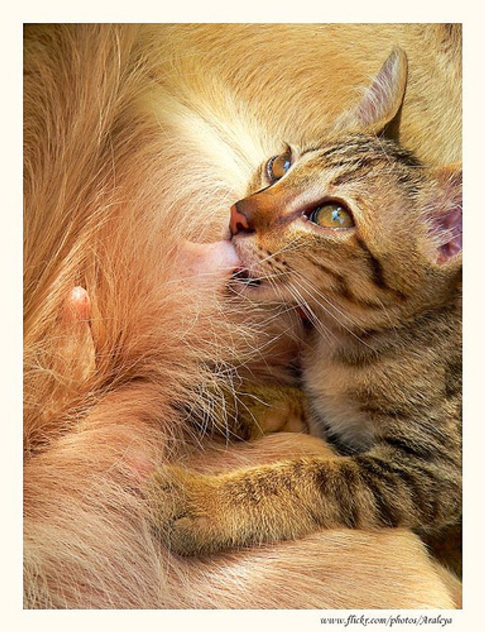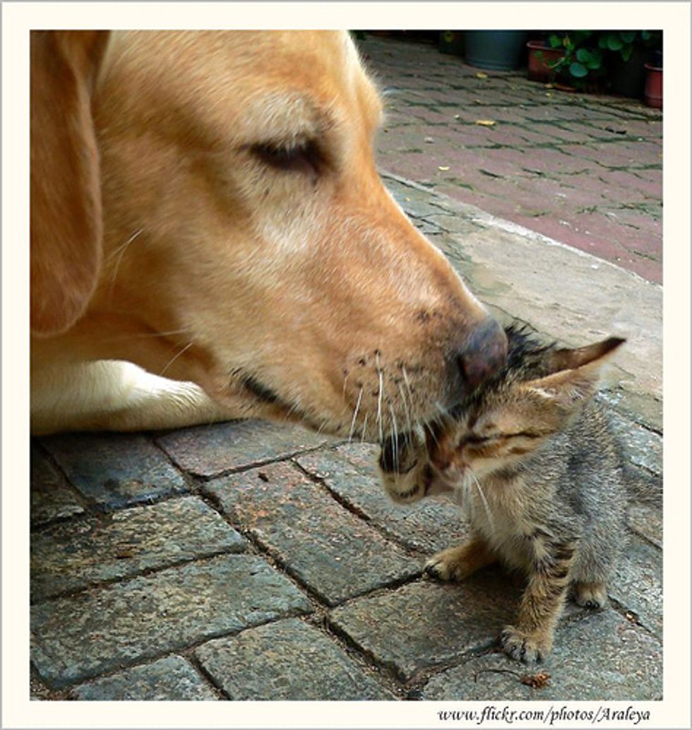 "I think Sanshiro was a special gift." Araleya spotted him trying to drink milk from her half Labrador and half Golden Retriever dog "Poon" multiple times, but initially she thought he just missed her own mother. However, the little tabby kitten kept suckling on her canine surrogate mother for quite a while until Araleya finally realized that Poon was actually nursing the little kitten with her own milk, even though she had never mated or had had any puppies.