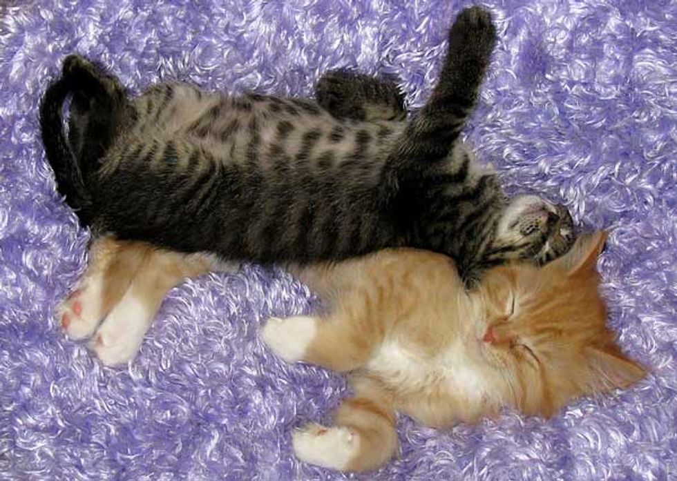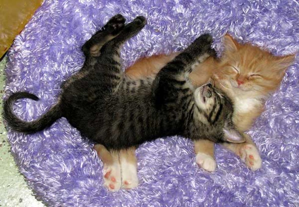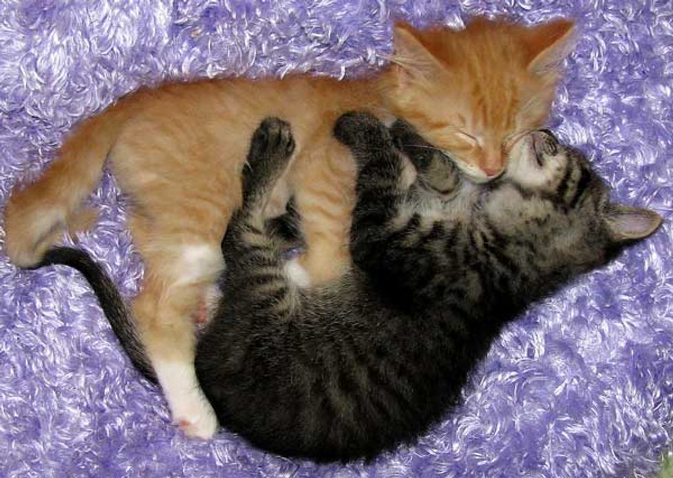 Kurt, a volunteer from Friends of Felines Rescue Center, was taking photos of the kitties and these two nap buddies were sleeping next to each other, but slowly snuggling into one big cuddle. It just doesn't get cuter than that!