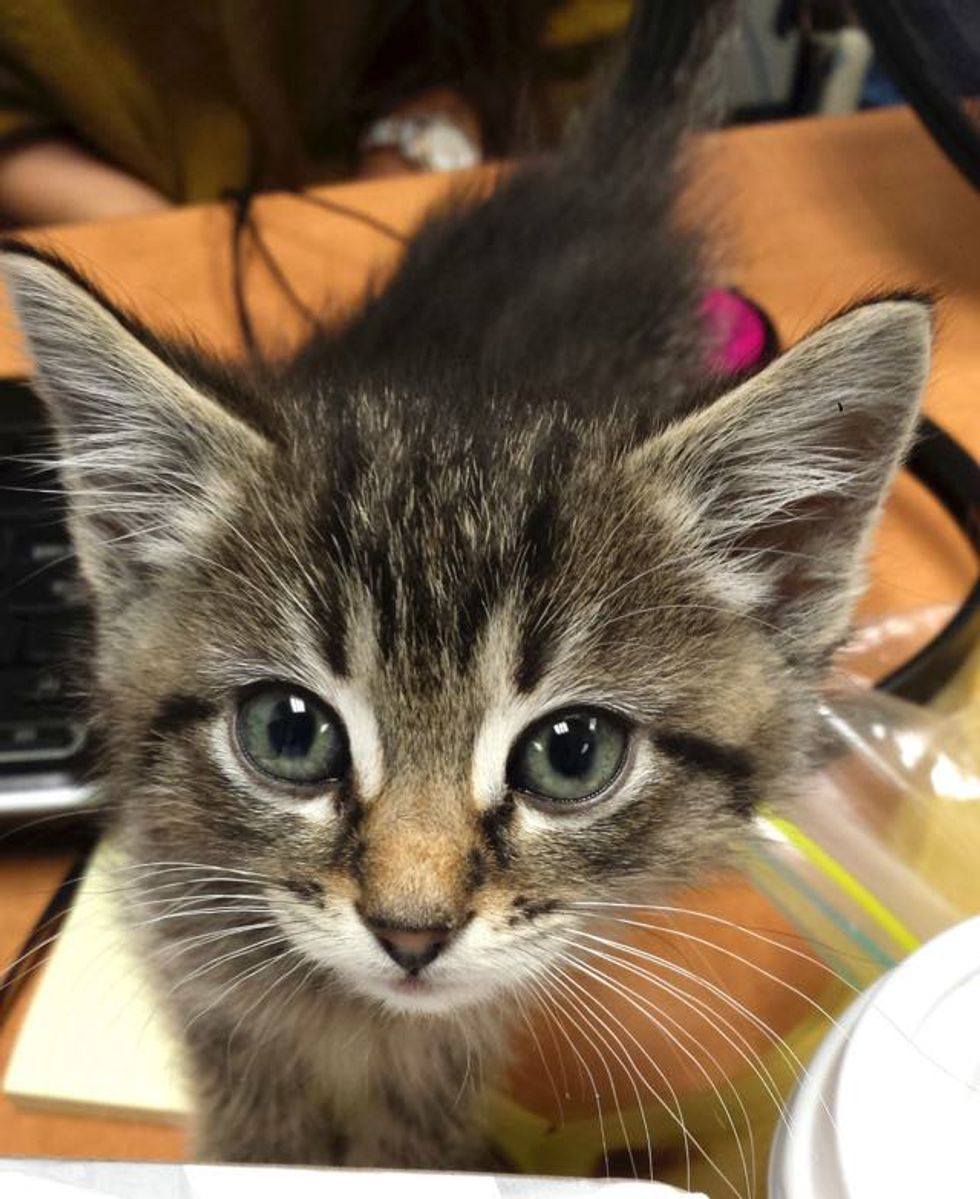An employee brought his tiny kitten, Mufasa, to the office so the little ball of fur could stay close to his human. Aww!