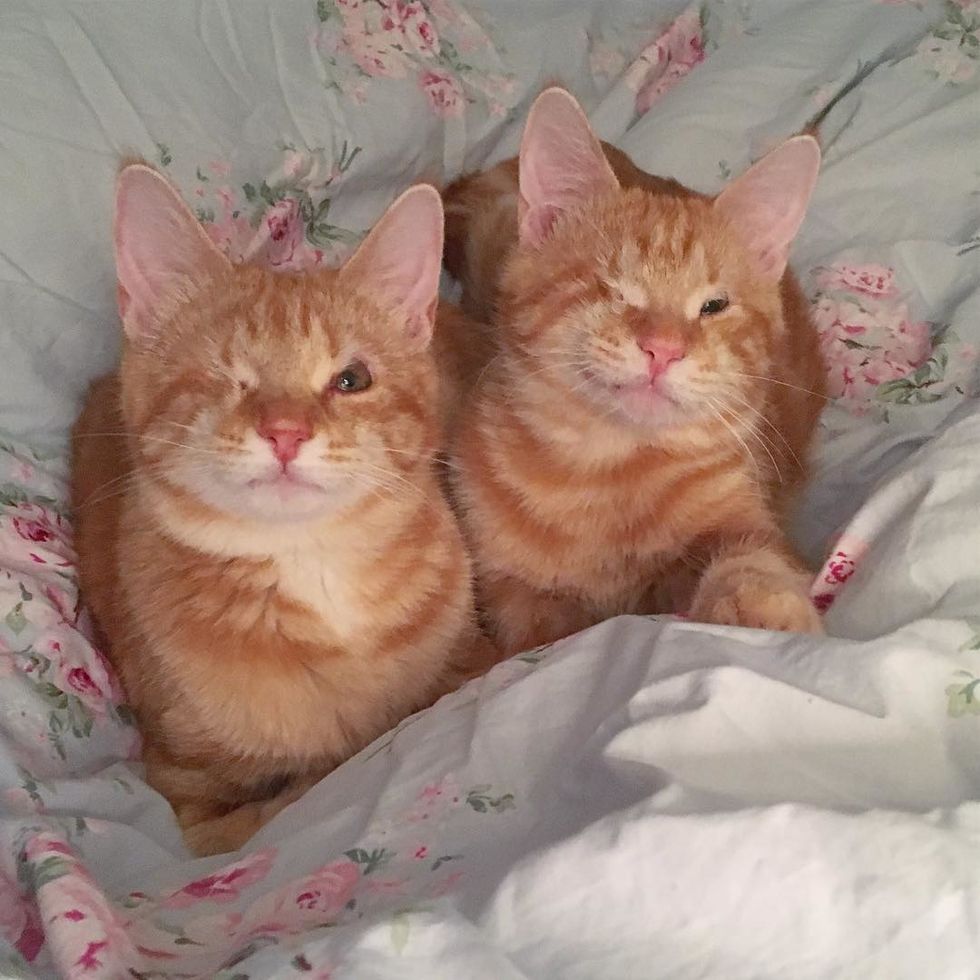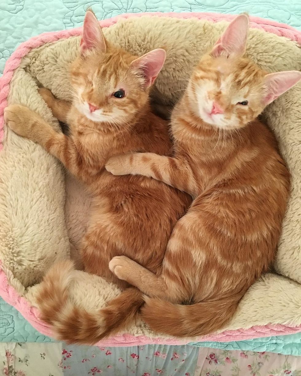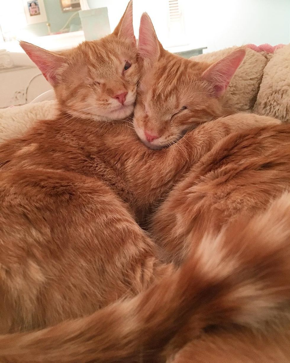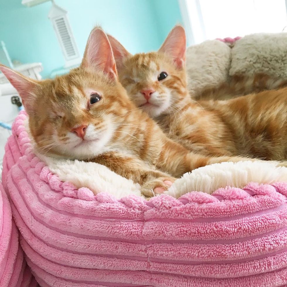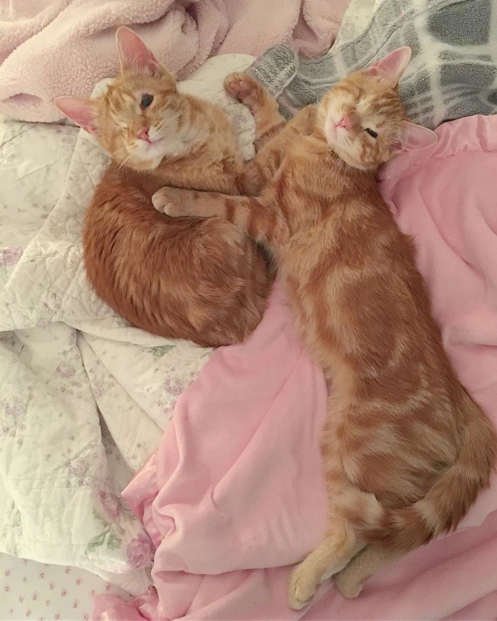 Happy and Merry were born without eyelids, a congenital defect called Feline Eyelid Agenesis. Their eyelashes were growing into their eyes, causing discomfort and pain. They also had one dead eye which had no sight and needed to be removed. "They have the exact same situation. They are so bonded as well… I could never separate them," Beth said via Instagram.