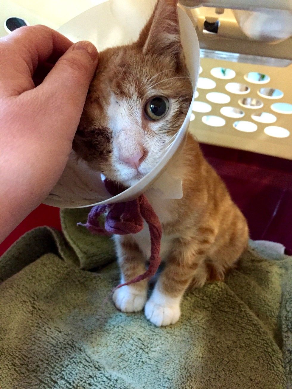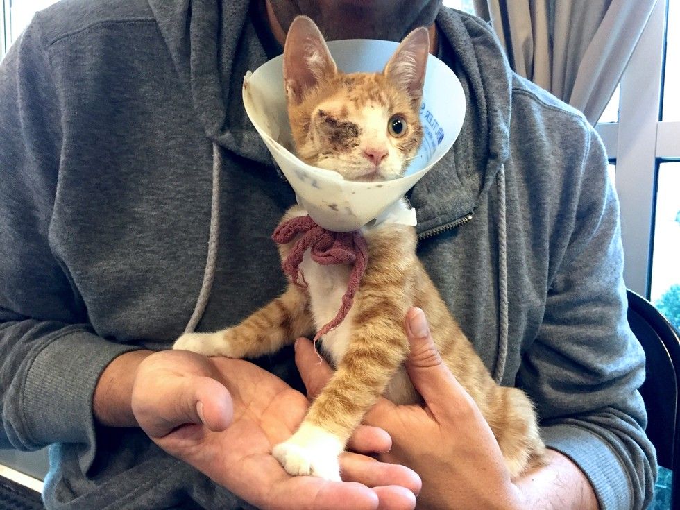 A kind couple offered to pick up the kitten and transport him to the rescue group. "When we got to the city pound to pick him up he already had on the cone and they had done a little work on his eye," FennelSoup said.