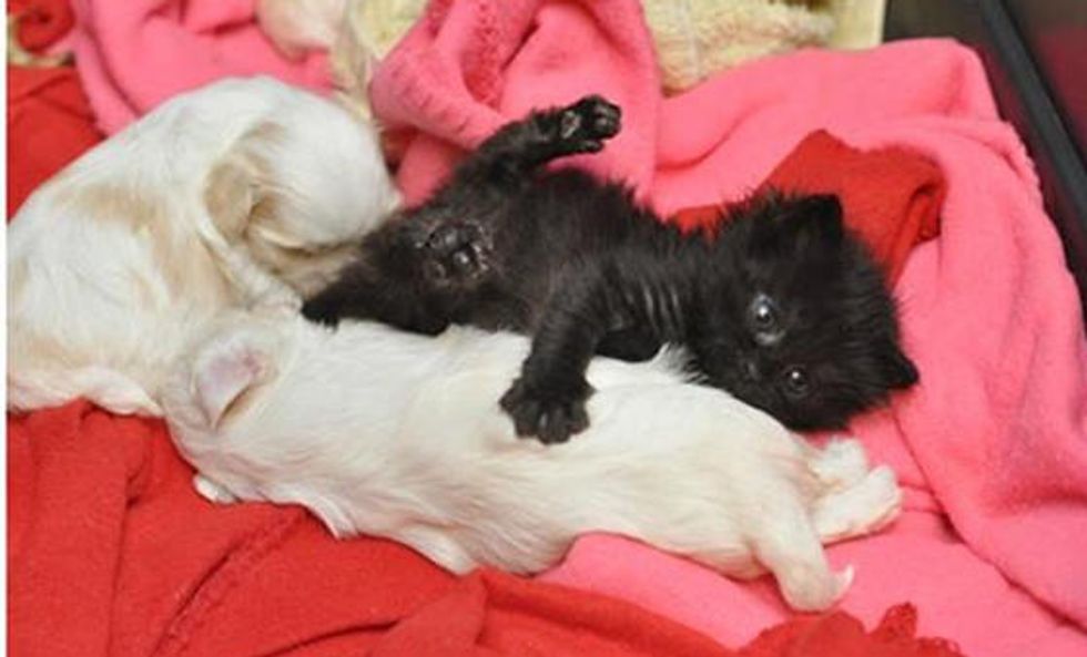 An orphan kitten named Roadhouse is now nursing alongside her new siblings, tiny pups, and getting all the love from her new mom, a white Maltese dog named Coco.