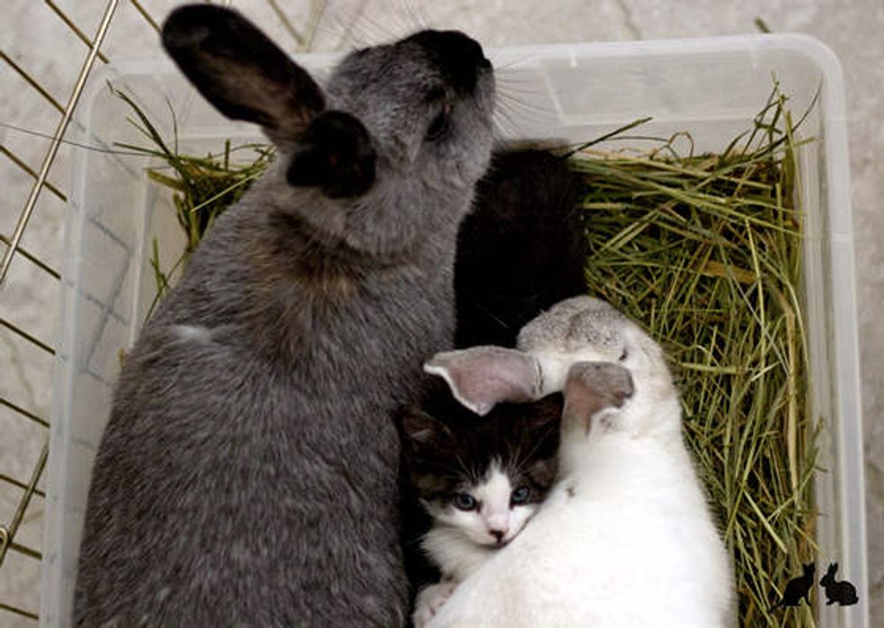 Mia bonded with the rabbits so well, especially Marlowe, that they ended up adopting her. "Mia came and joined her BFF (bunny feline friend) Marlowe while he was in a bonding session with Melba (the rabbit). I adopted Mia for Marlowe back in June when he helped keep six orphan kittens company for three days," said Liz via flickr.