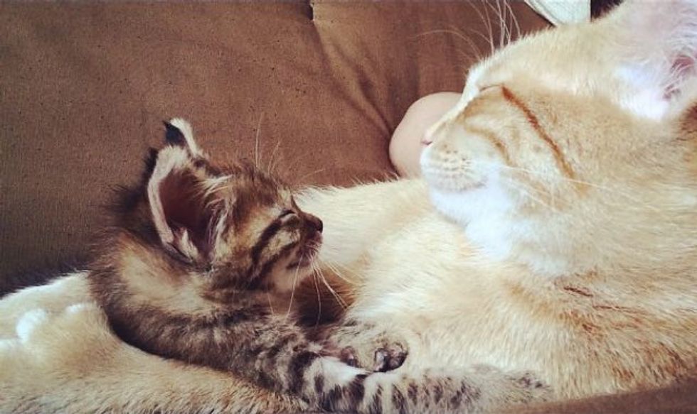 Little Milkshake was found an orphan. When she came to her new home, Sia, who is also a rescue cat, took her in as her own.