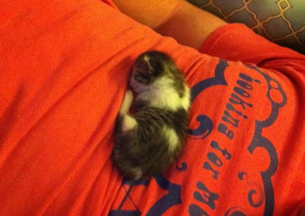 "This is Moses, filling up on kitten formula. He was orphaned just a few days after birth, and just opened his eyes the day before this."