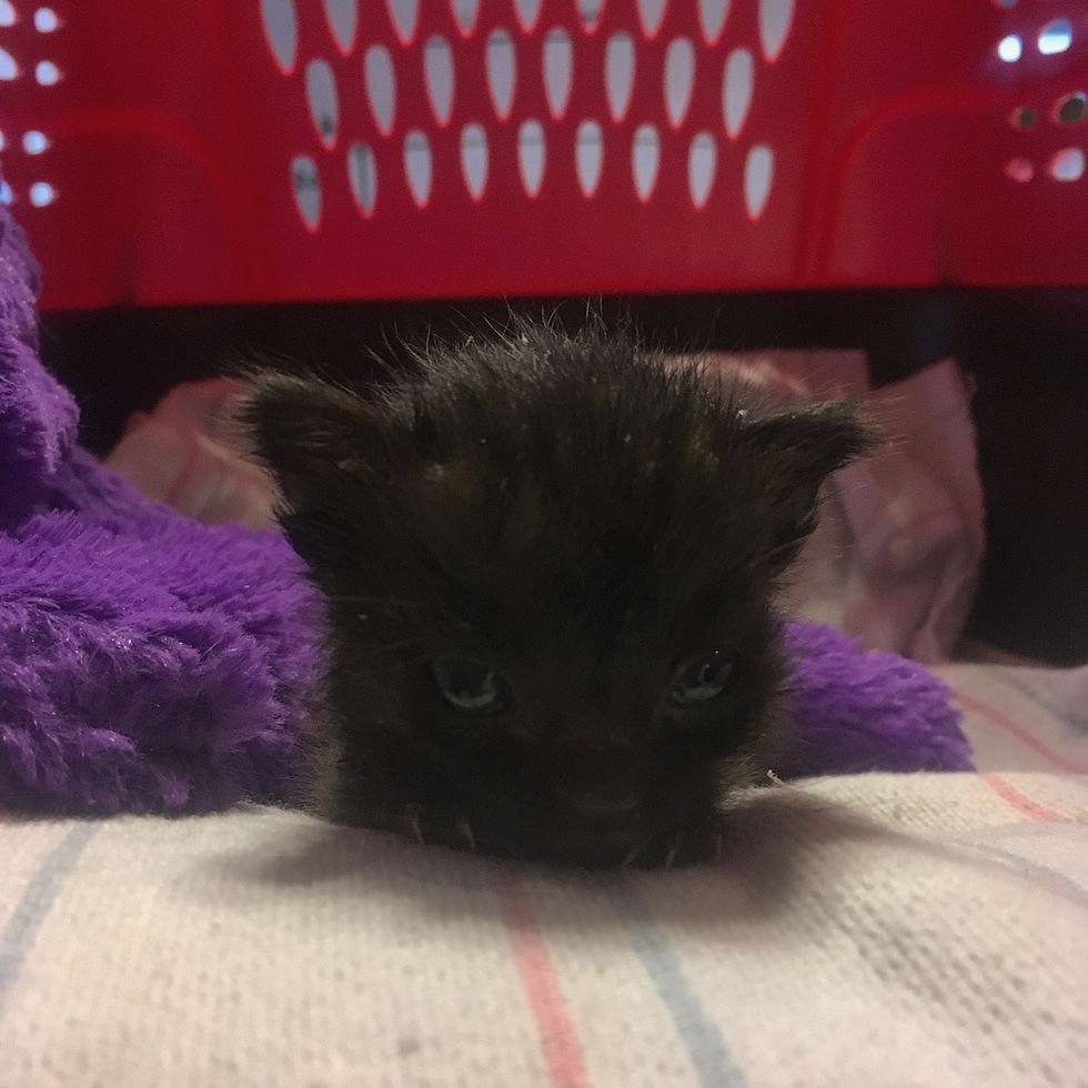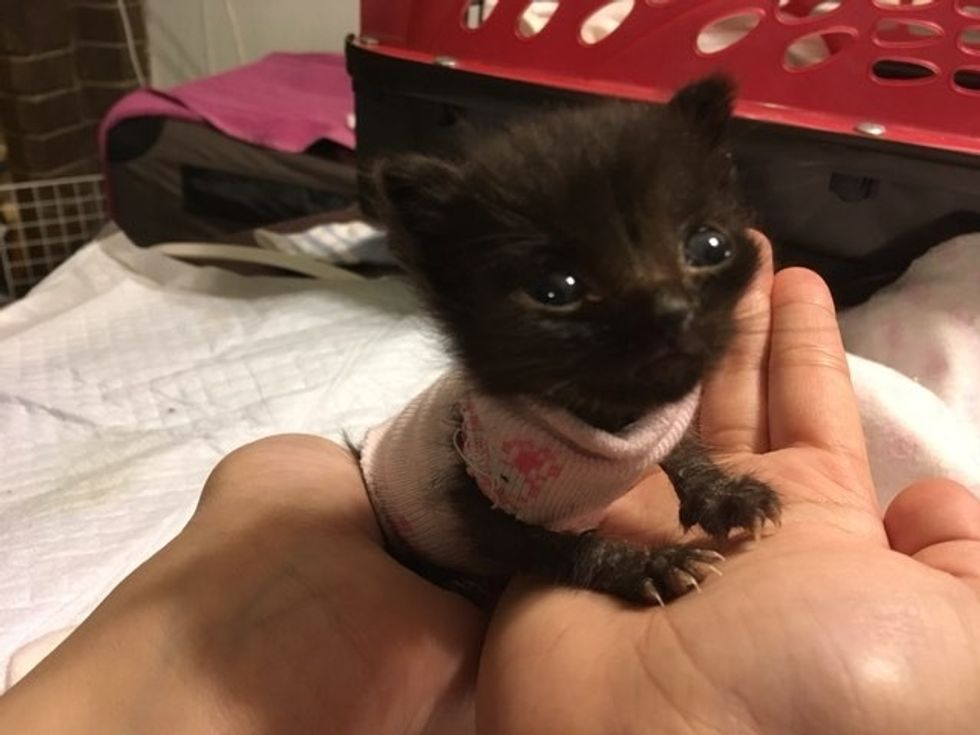 A tiny kitten was found along with her sister without a mother in sight. When she came to the shelter, she was just the size of a newborn kitten.