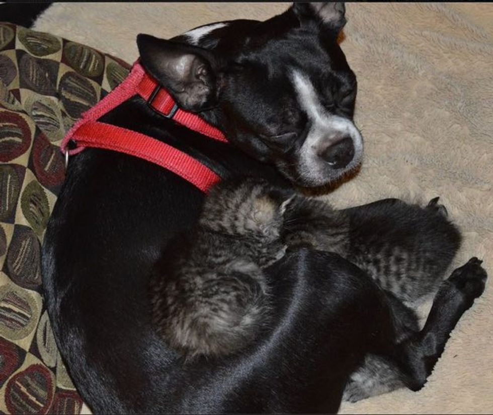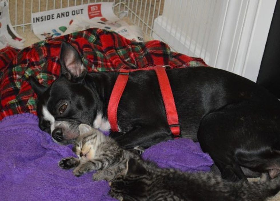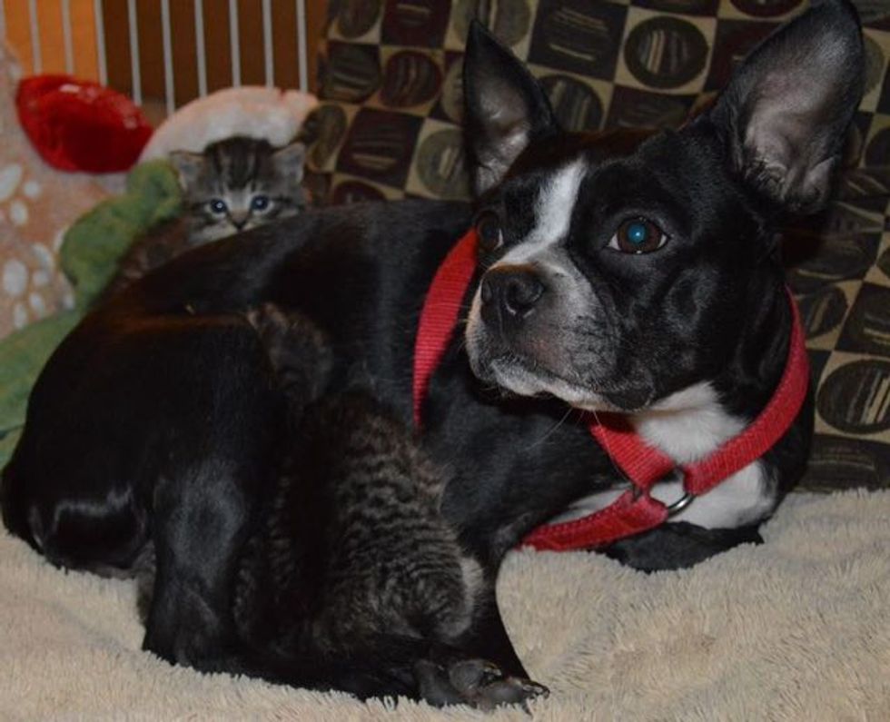 A litter of orphaned kittens were rescued in the woods. When Shannon William's daughter brought them home, their Boston Terrier began to nurse them despite not having been pregnant.