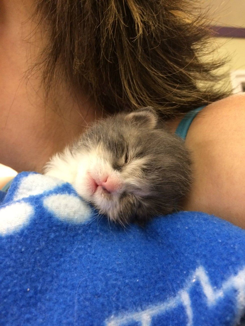 He fell asleep on his foster mom under a warm blanket, purring up a storm.