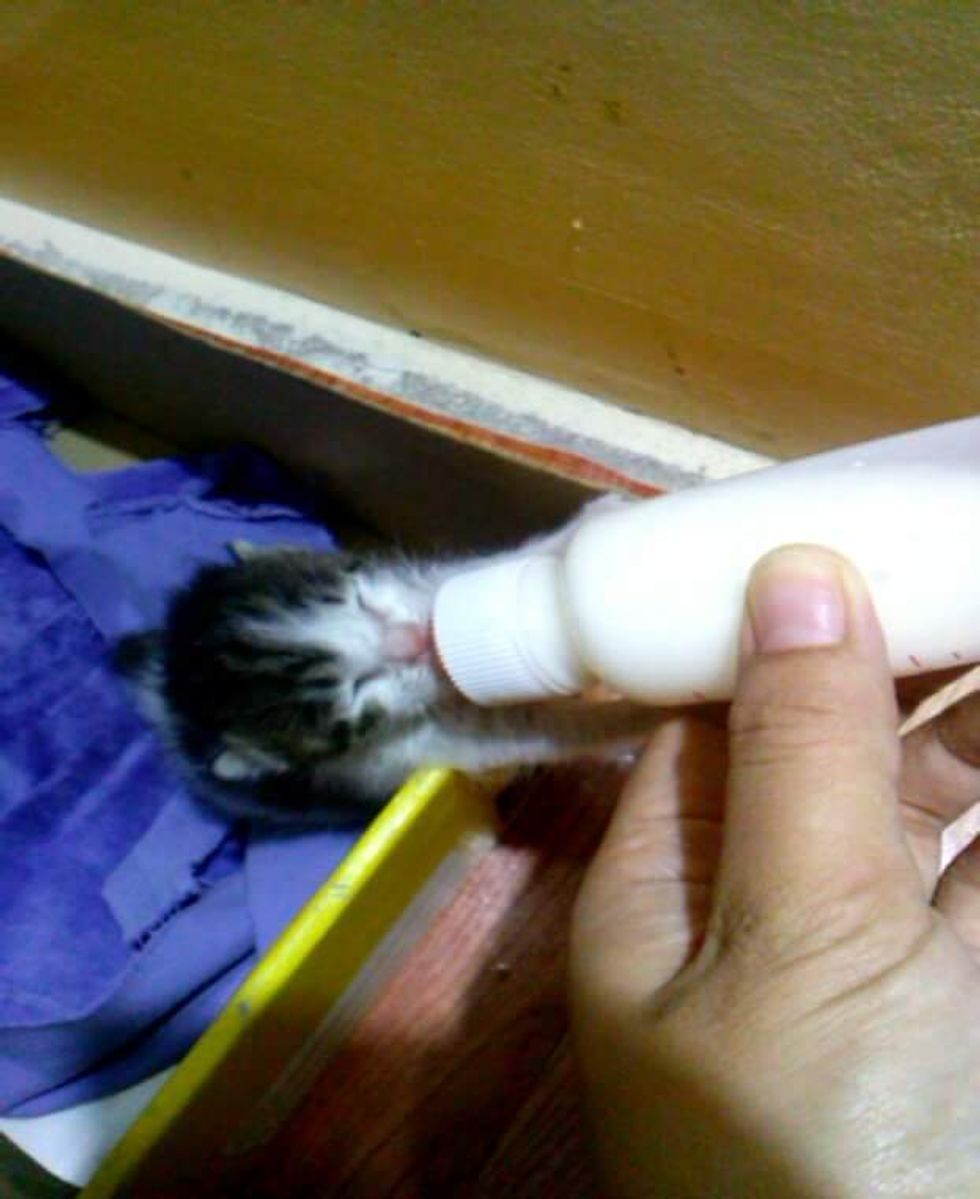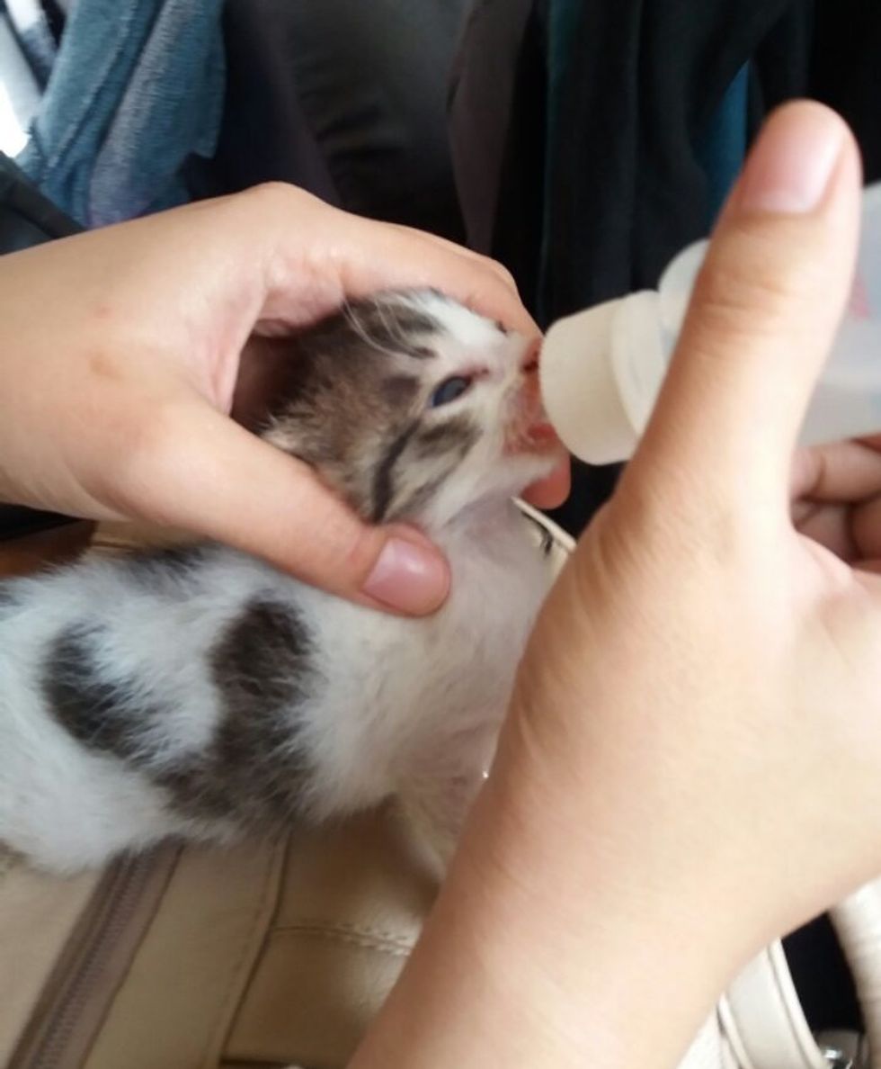 A tiny kitten whose eyes were still closed, latched onto her first bottle and started eating for the first time after she was found under a bush all by herself.