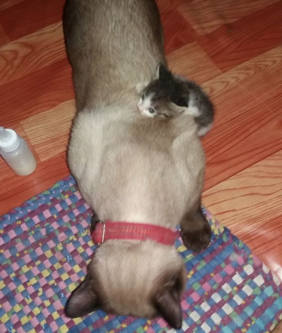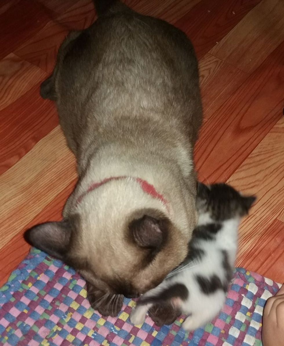 When Sissy was ready to meet her older siblings, she was immediately loved by Vanilla the cat. He gave her a bath to officially welcome her into the family.