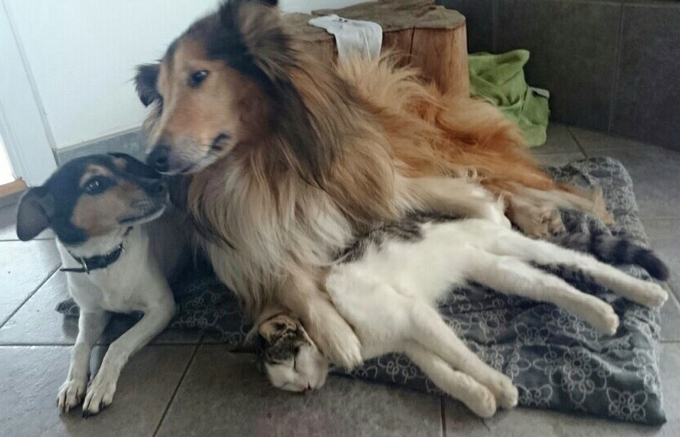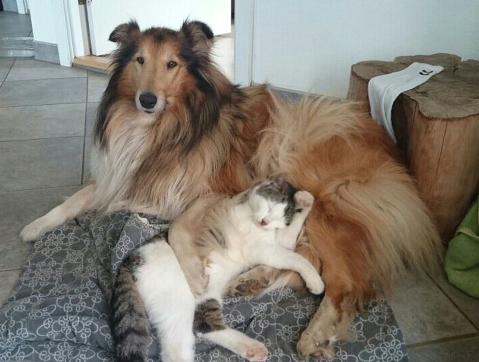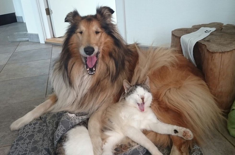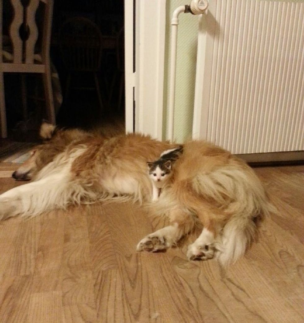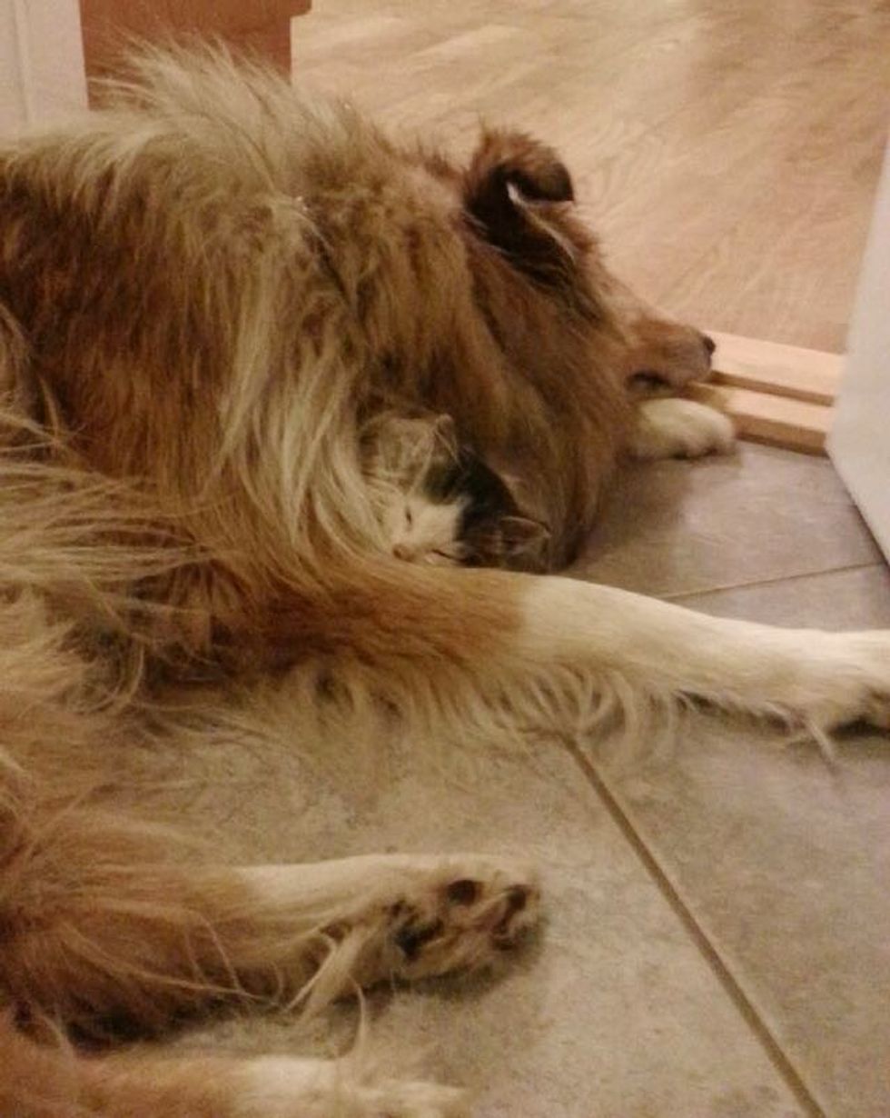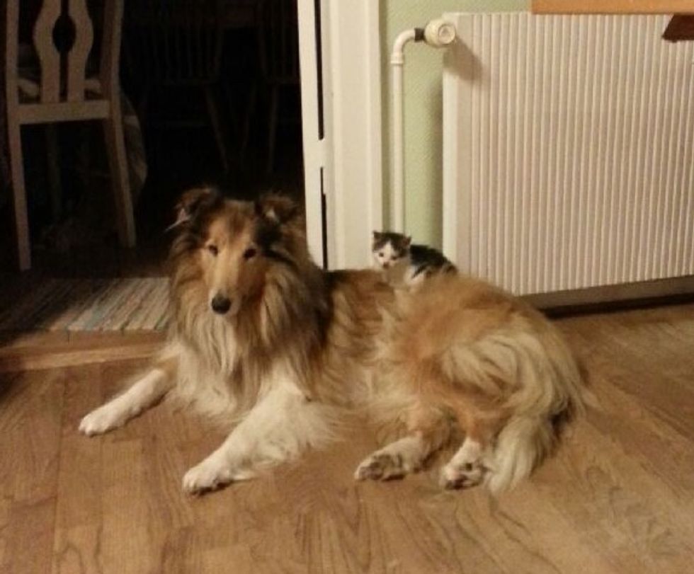 A little orphaned kitten was meowing for his mom. When a Collie heard his cry, she took in the tiny fur baby and became his new mom.