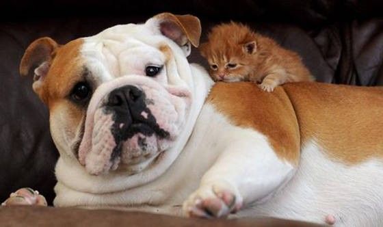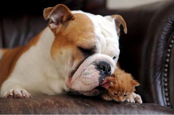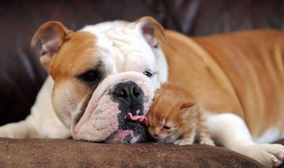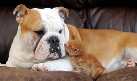 A tiny orphaned kitten has found an unusual new mom, a bulldog named Harley, who adopted him and started producing milk to nurse the little one.