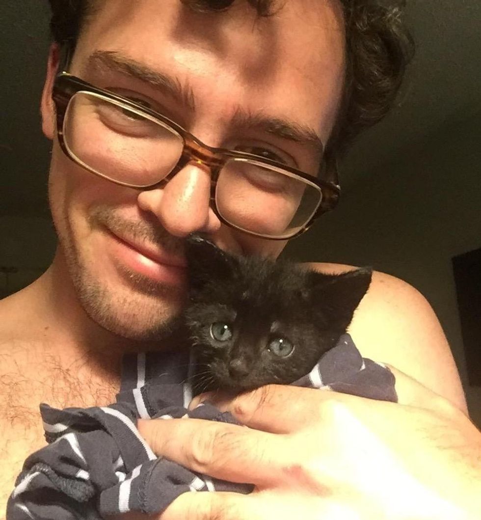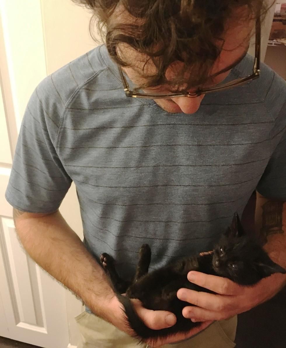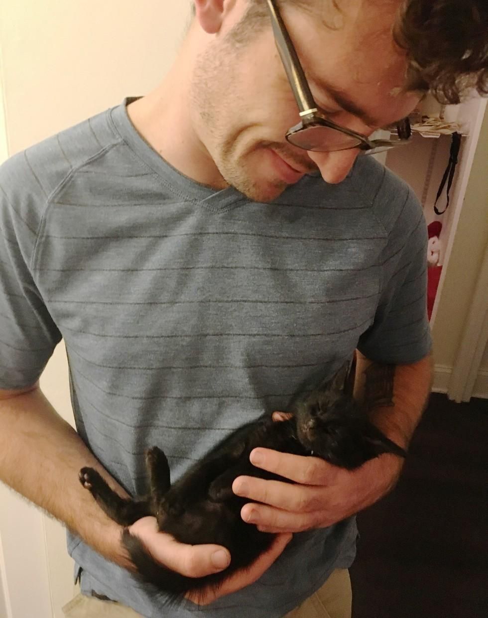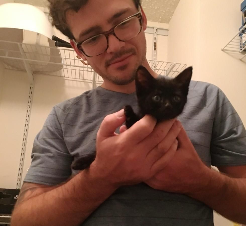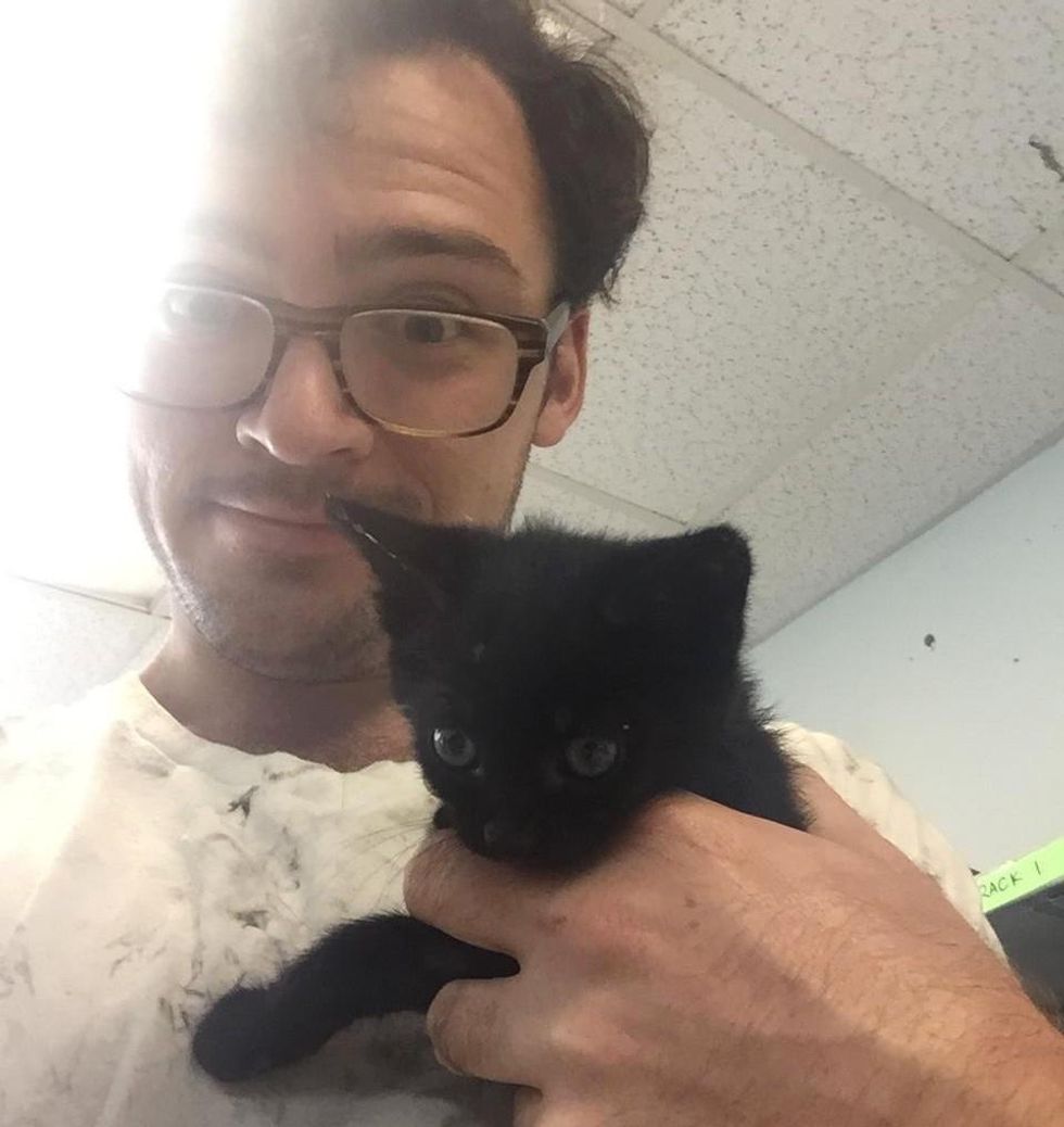When he scooped up the kitten for a cuddle, the sweet furball switched on his purr motor and fell asleep in his arms. Luke immediately offered to foster him before he could officially adopt him.