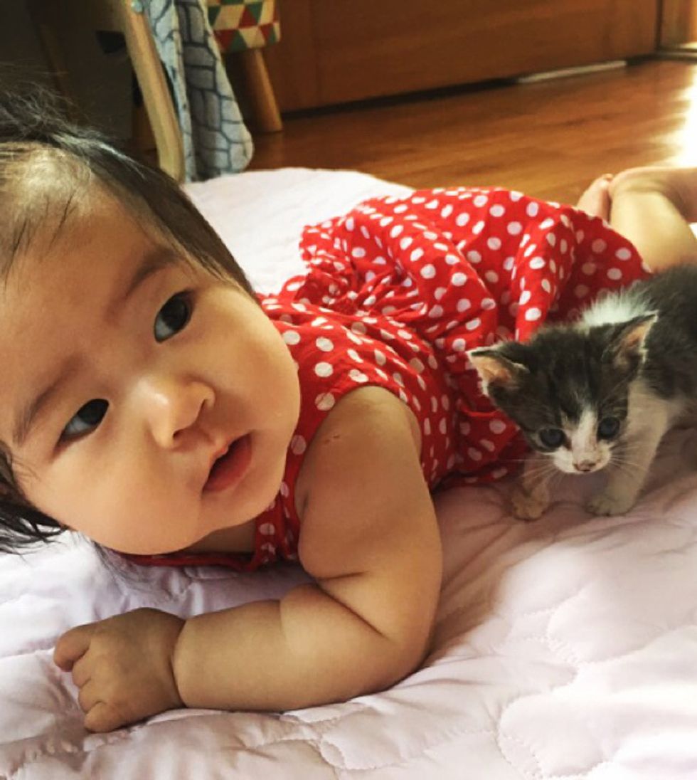 The little kitten bonded with their baby girl. Best friends in the making :).