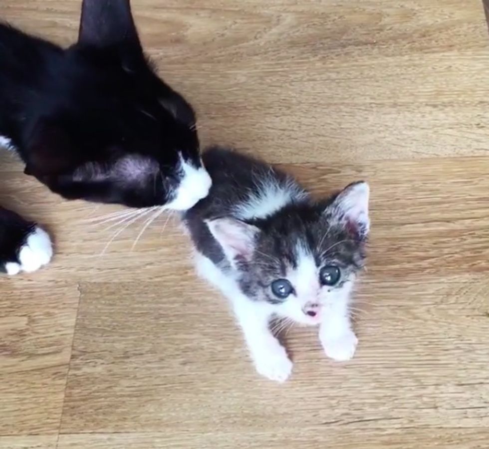 She washes the kitten after every meal, and the whole family are working together to nurse the little fur baby back to health.