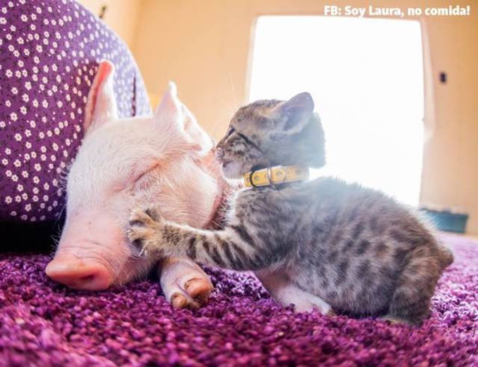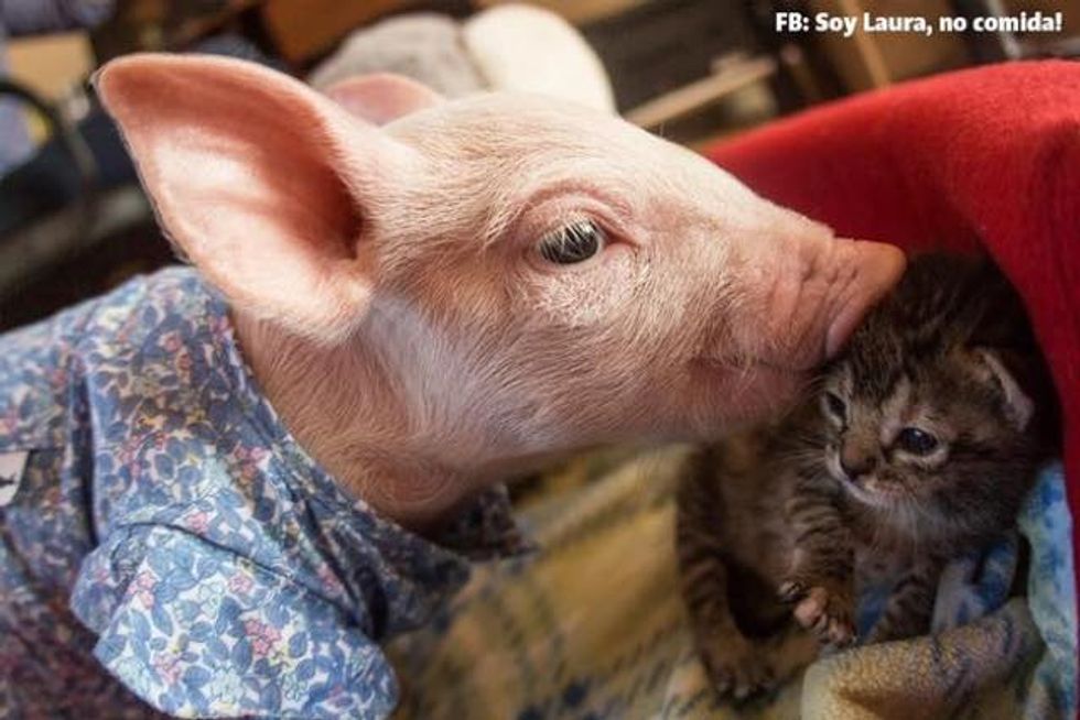 Orphaned kitten Marina and rescue piglet Laura found each other at an animal sanctuary and now are growing up together! They are adorably inseparable!