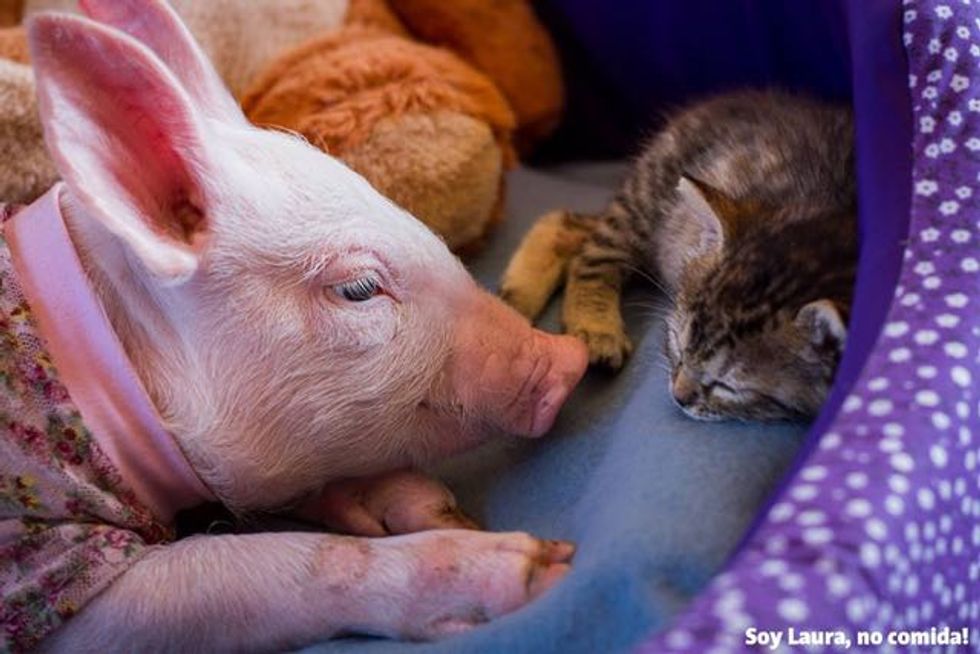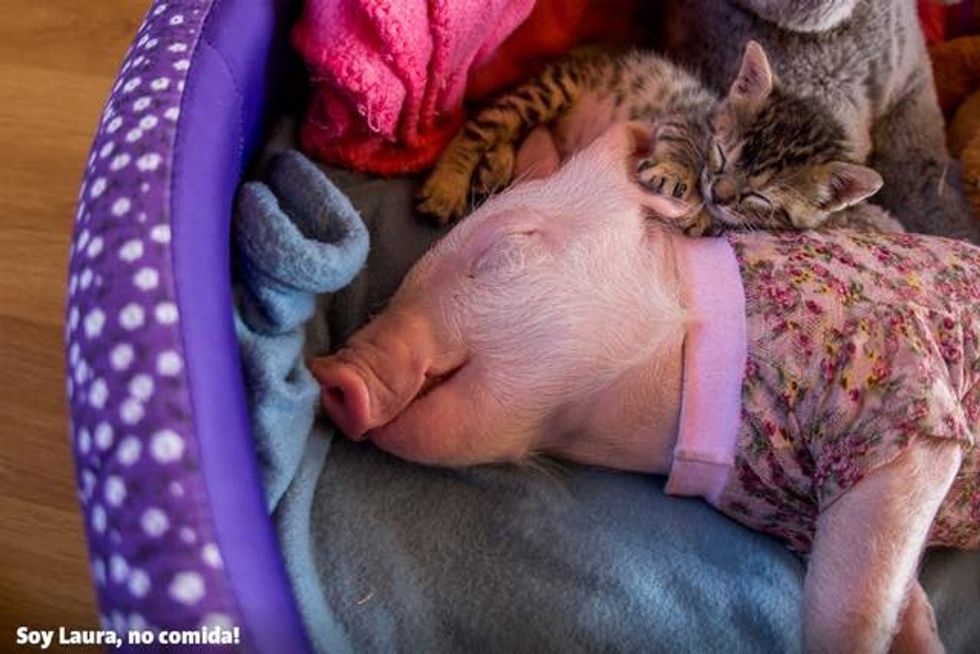 Marina the rescued kitten was in desperate need of a family and that's when Laura the piglet came into her life and became her forever cuddle buddy.