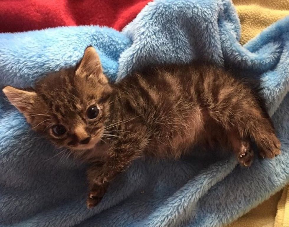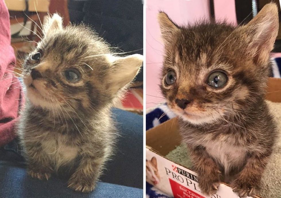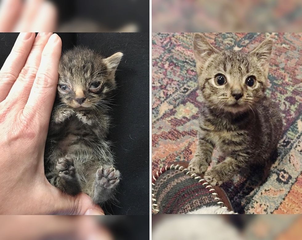 A palm-sized kitten found help in the nick of time. At five weeks old, he was just the size of a one-week-old kitten.
