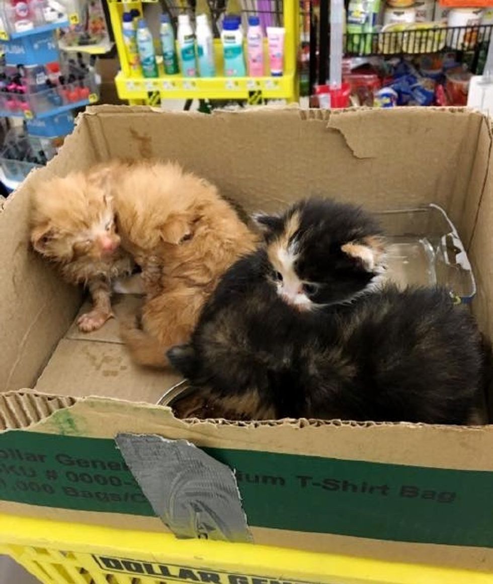 A store employee heard kitten cries coming from the parking lot. When he went to investigate, he found four tiny babies in a bag by a dumpster. Immediately, he took them in and kept them warm.