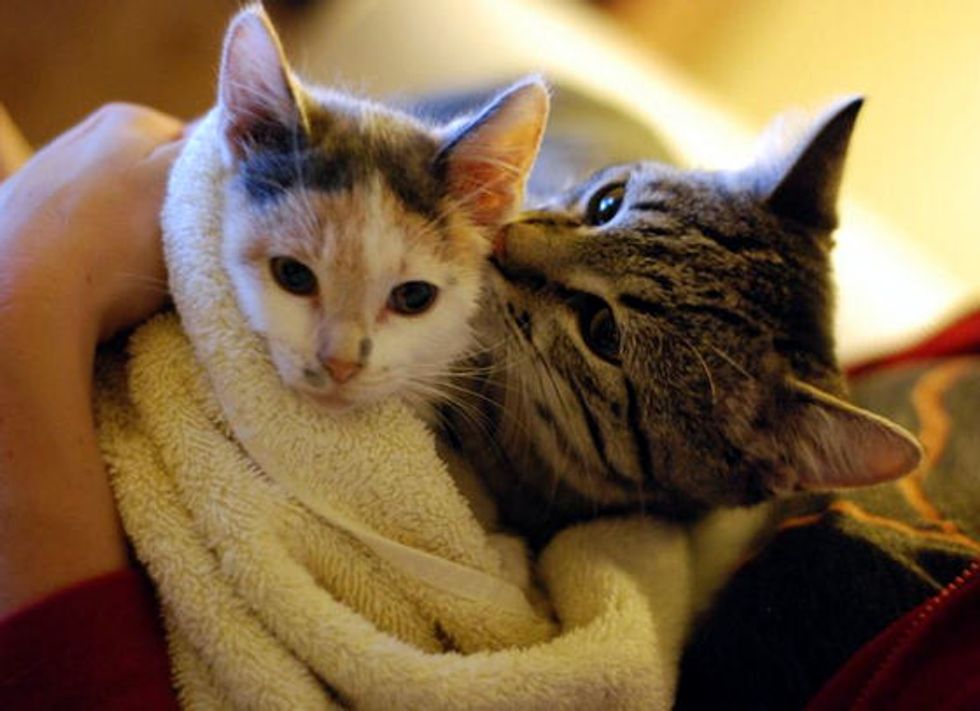 Pip the kitty with permanently bent front legs, grooms Izzy the kitten with permanently-bent rear legs. Cuteness alert! (video)