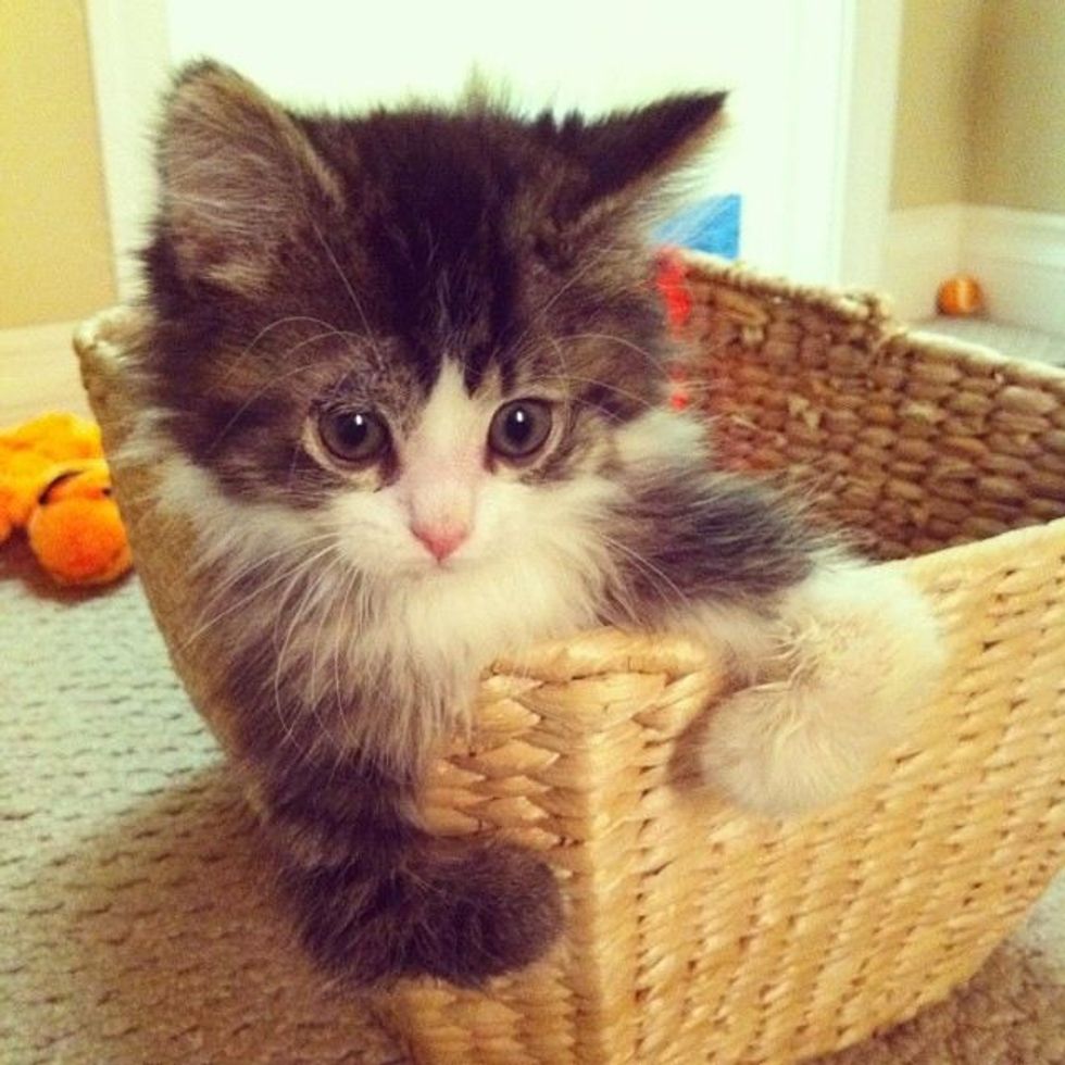 "A baby photo of little Pip the day I rescued him! That basket helped him sit upright despite his arms and he slept in it until he physically couldn't fit anymore."