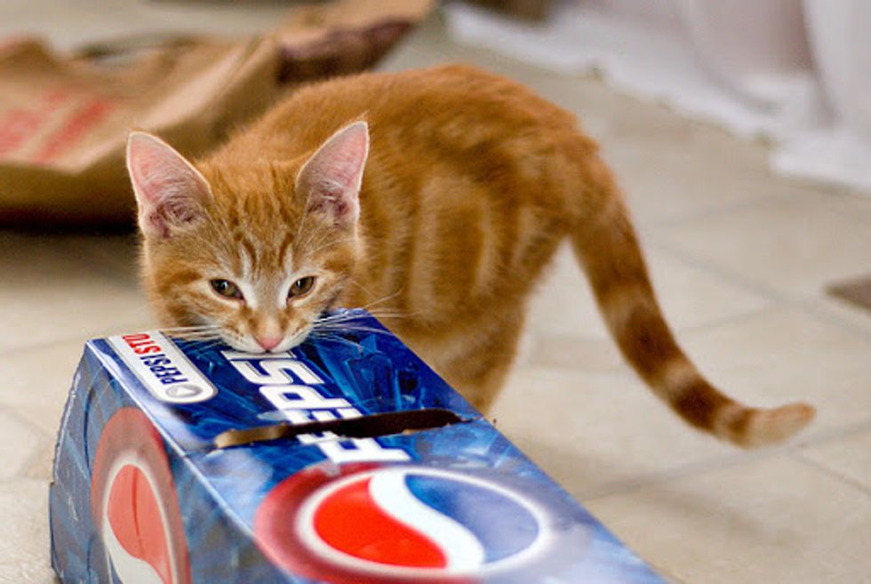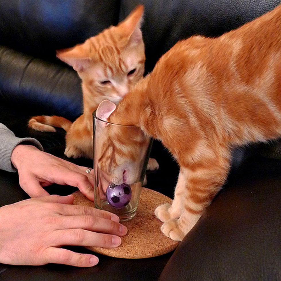 One evening "Sprite stuck his head into his daddy's water glass, but after a little while he had grown bored of examing the glass in detail," so his daddy "threw one of their rattle toys into the glass to entice them." Both of the kitties stayed to continue their investigation.