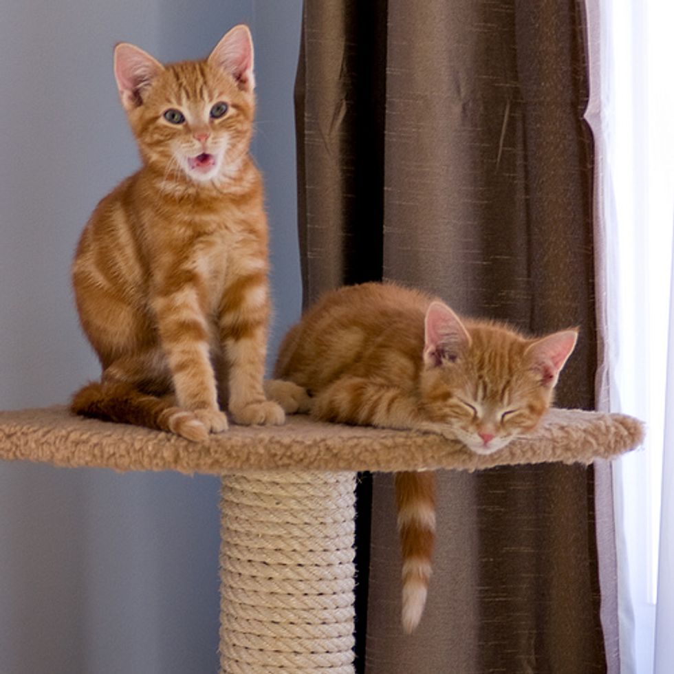 Sprite and Pixel found their parents through an adoption event. Both of them are ginger tabby kittens who love to perch on their parents laps.