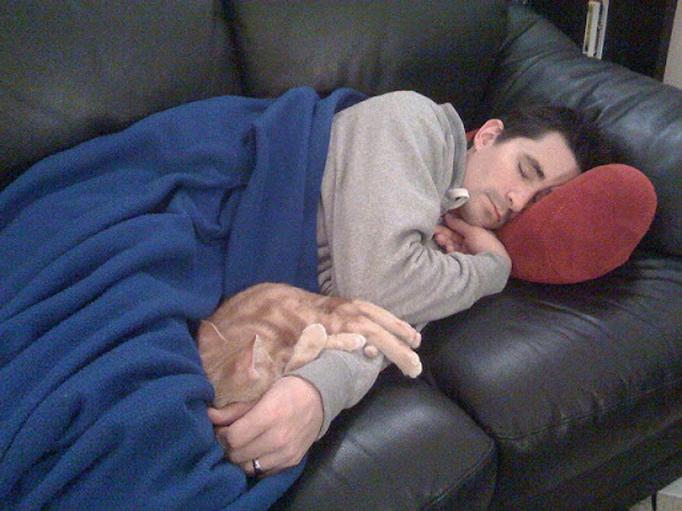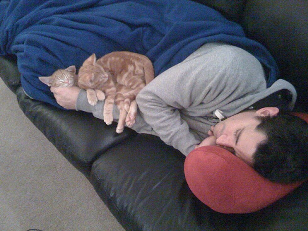 Pixel and Sprite are very close to their daddy. They love to hang out and snuggle up against him when he naps.