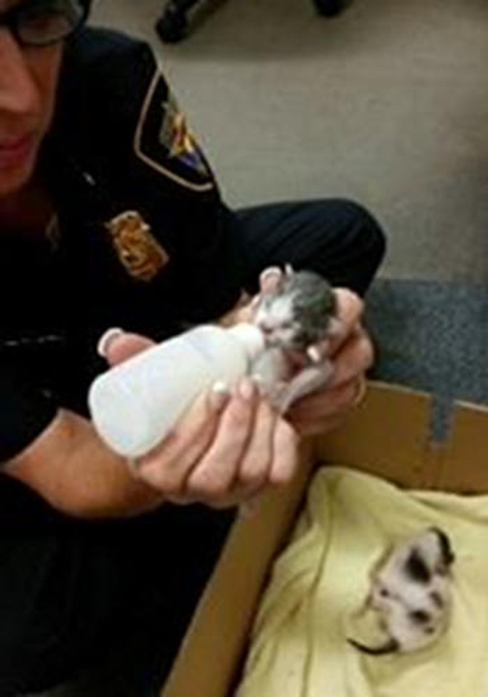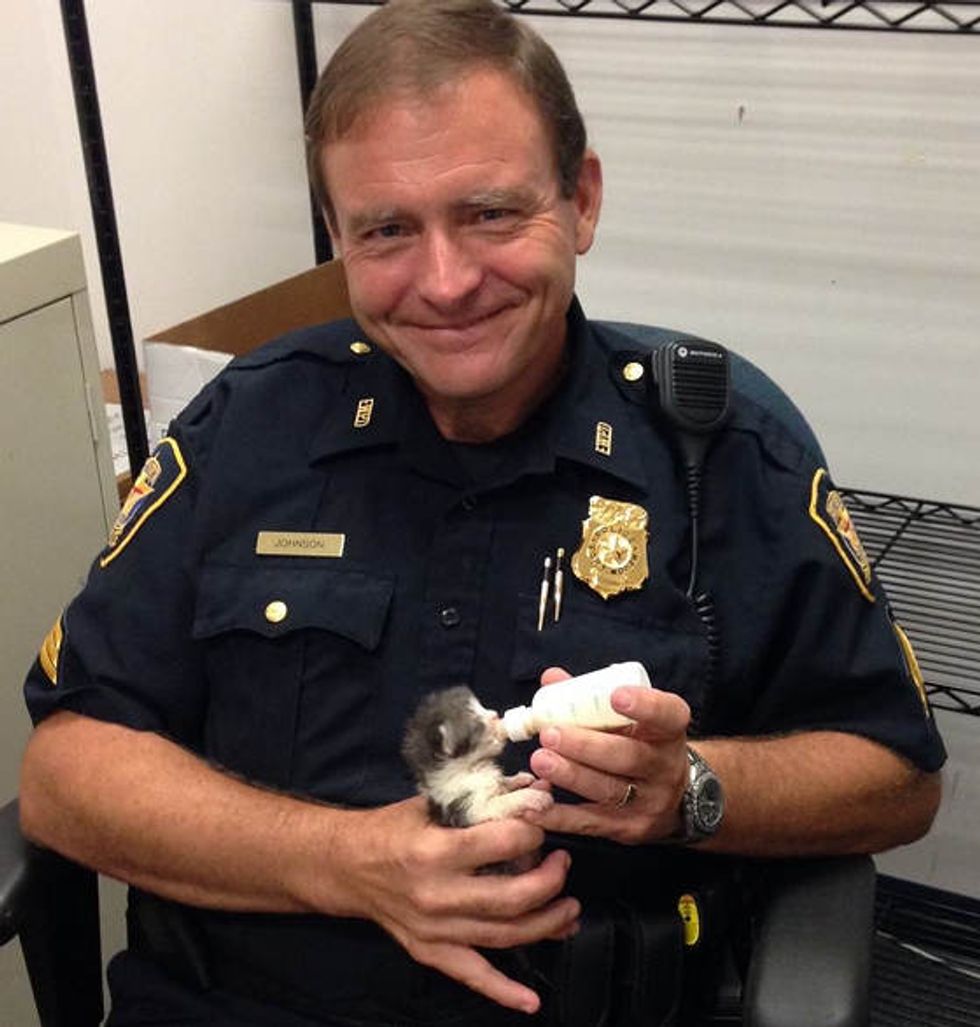 Officer Johnson and his colleagues rescued three tiny kittens in the parking lot and are now taking turns to care for them until they can get adopted.