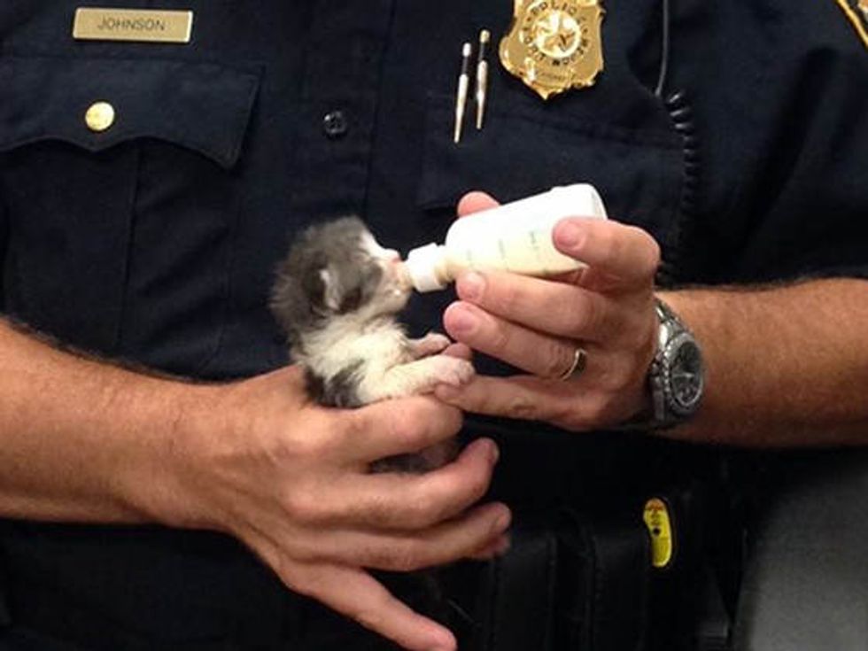 Three tiny kittens were rescued in the parking lot by police officers from Fort Worth Police Department. They are pitching in and taking turns helping the kittens until they can get adopted.