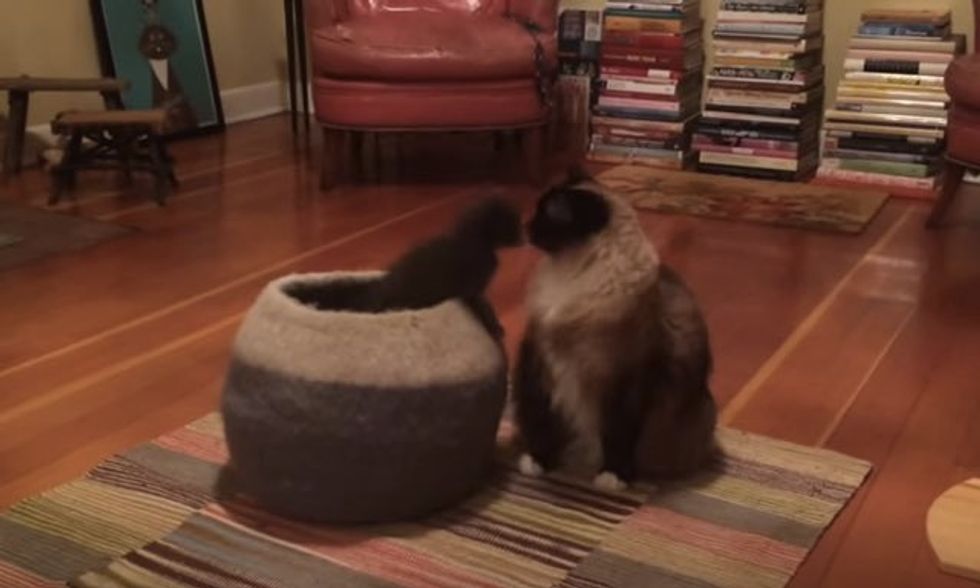 They got two foster kittens that are natural pranksters. As soon as they moved into their new home, they started playing pranks on the big kitties.