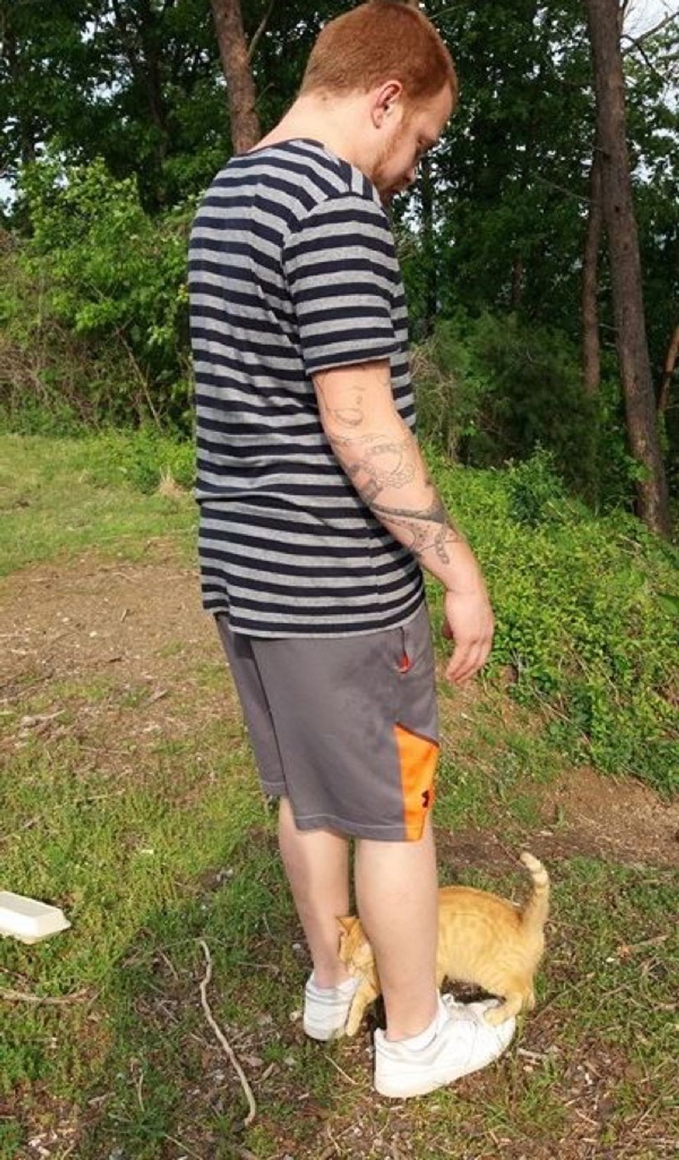 The friendly stray cat came across a couple and immediately took a liking to the young man. She followed him around, rubbing his legs and wouldn't let him go.