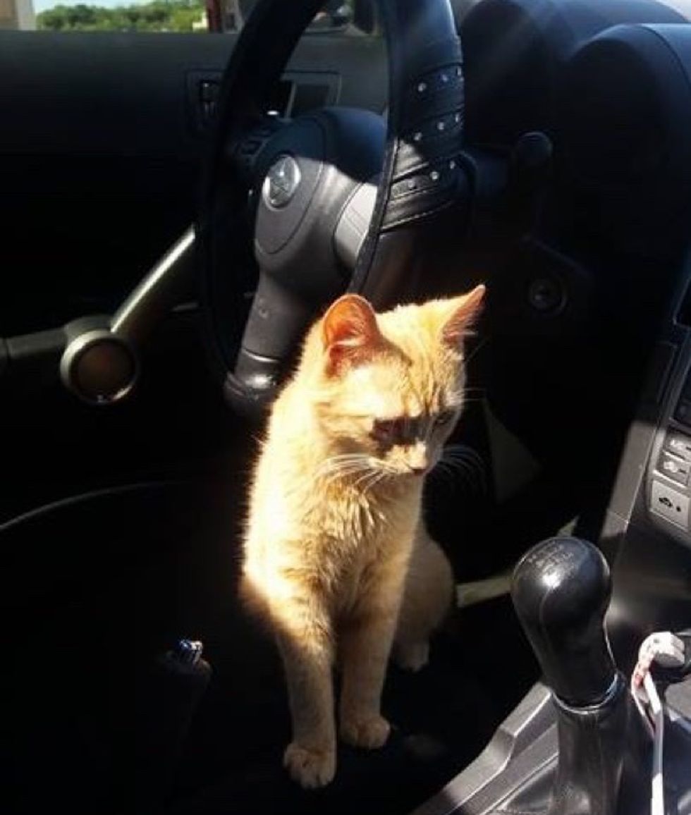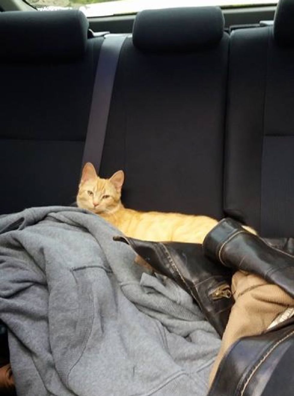 The man realized that the cat had chosen him and wouldn't take no for an answer, so he gently picked her up and placed her in his car.
