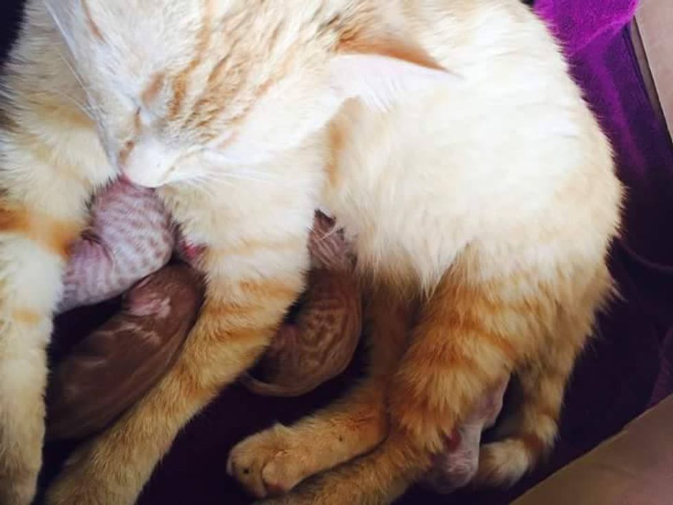 One day later, her belly popped and she gave birth to four very tiny kittens. The young mama was no more than six months old, and soon they realized that she couldn't produce milk and the kittens weren't looking good.