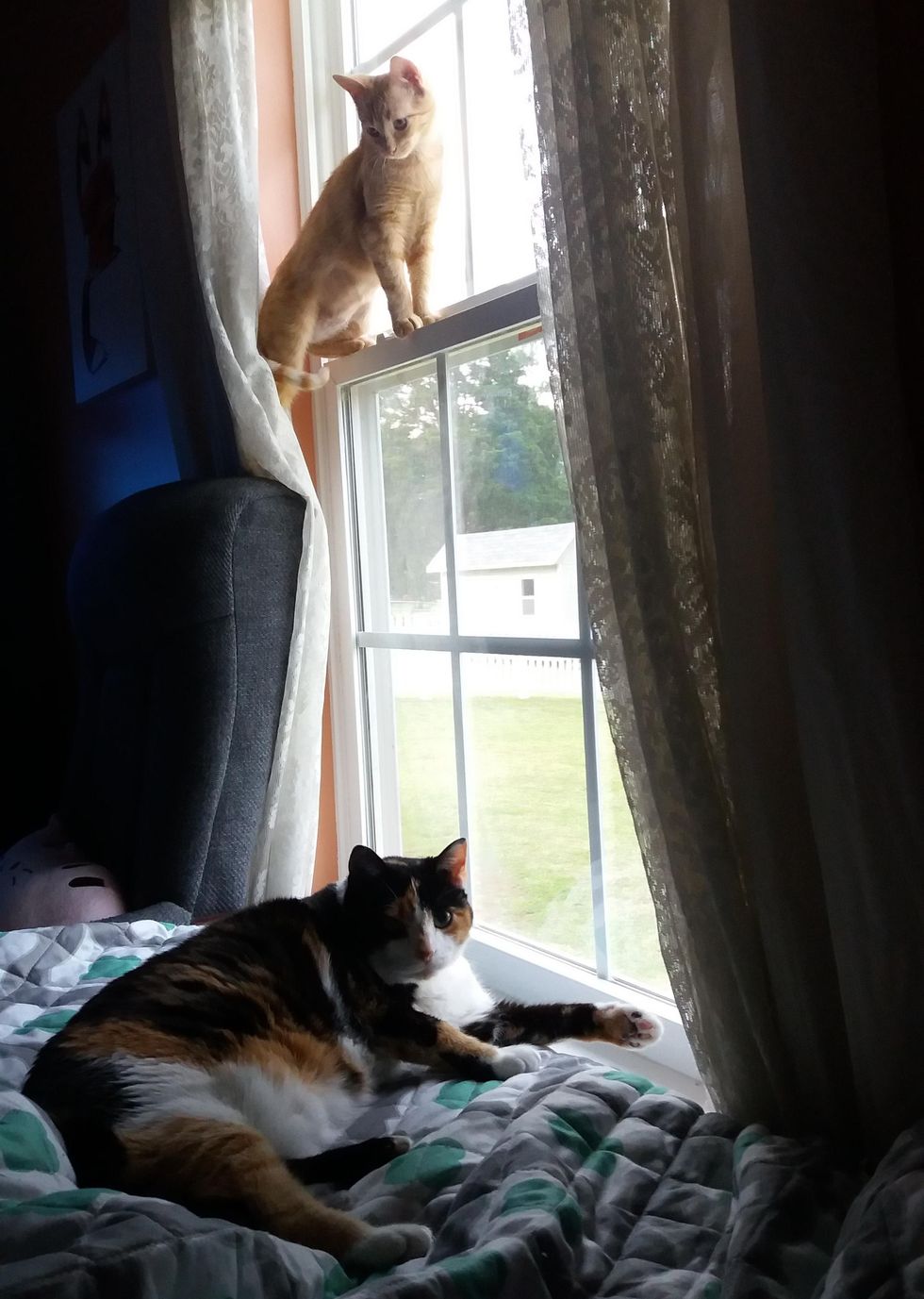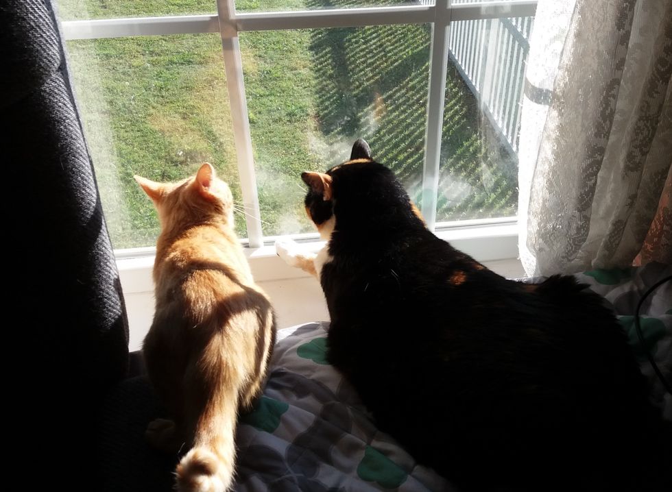 Now they spend time by the window, enjoying cat entertainment together and just relax in their humans' bed, watching the day go by.