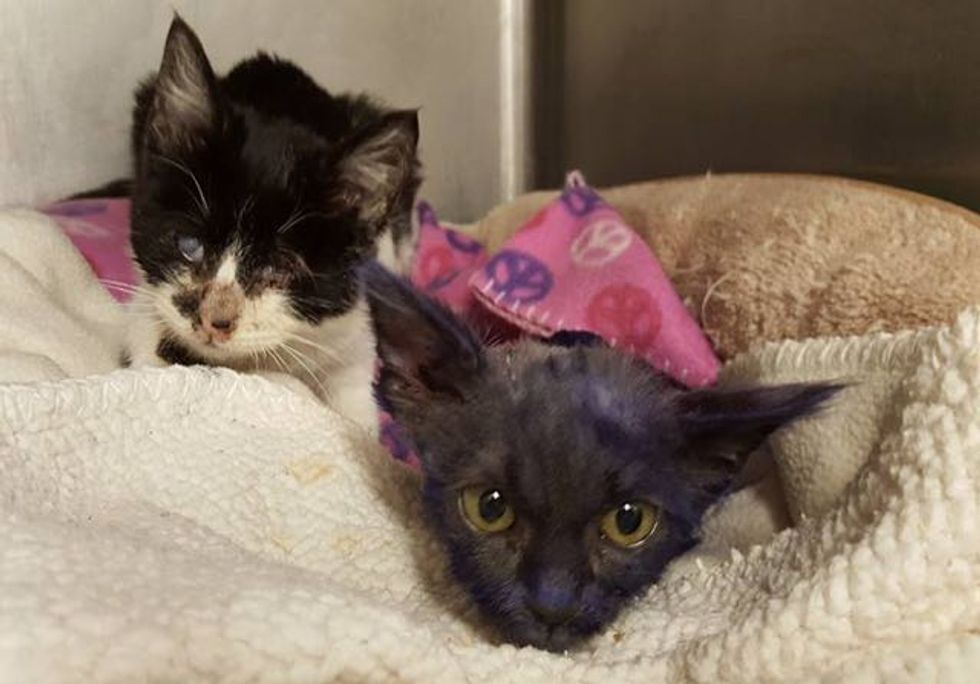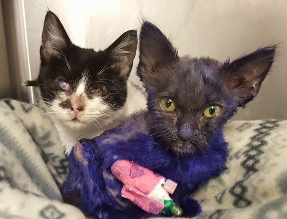 A purple kitten rescued from an unfortunate fate is now cuddling with his new best friend, a blind cat. They are both on the road to recovery and their companionship is helping each other heal.