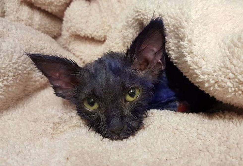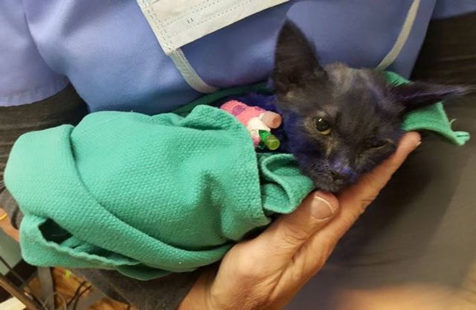 A 7 week old kitten weighed less than two pounds was rescued and brought into the Nine Lives Foundation in Redwood City, California. He was dyed with purple ink and was likely used as a chew toy for another animal.