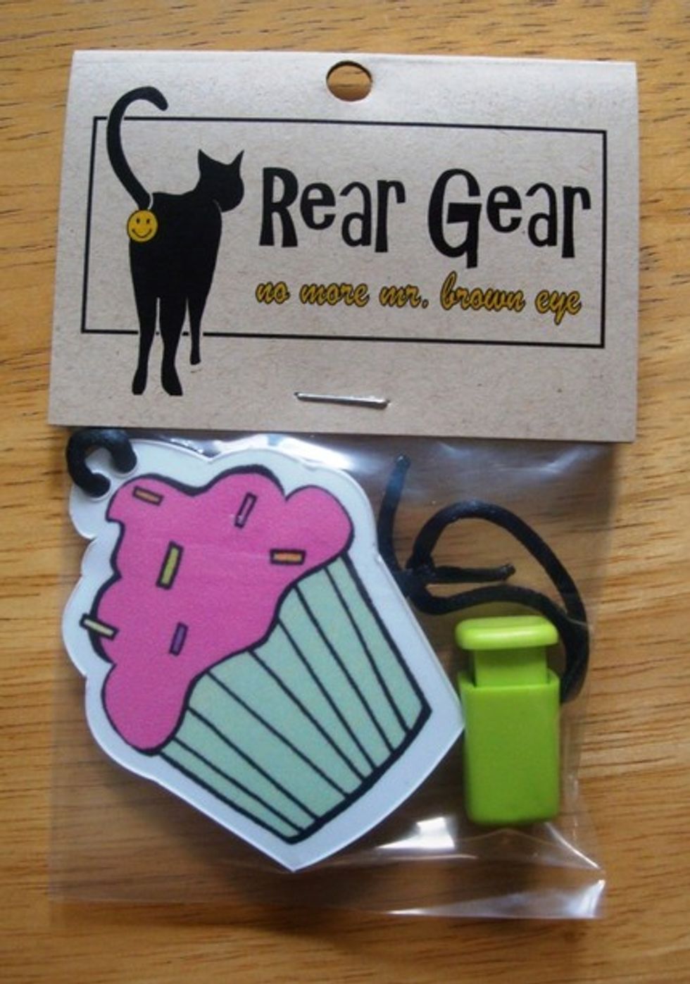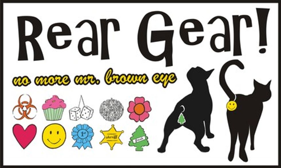 This is a very silly concept - to have your kitty's rear covered up with a Rear Gear that comes in a variety of images such as a disco ball, air freshener, heart, flower, boihazard, smiley face, number one ribbon, cupcake, sheriff's badge, dice and a custom design if you'd like.