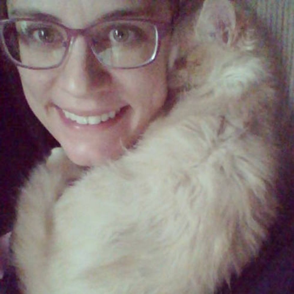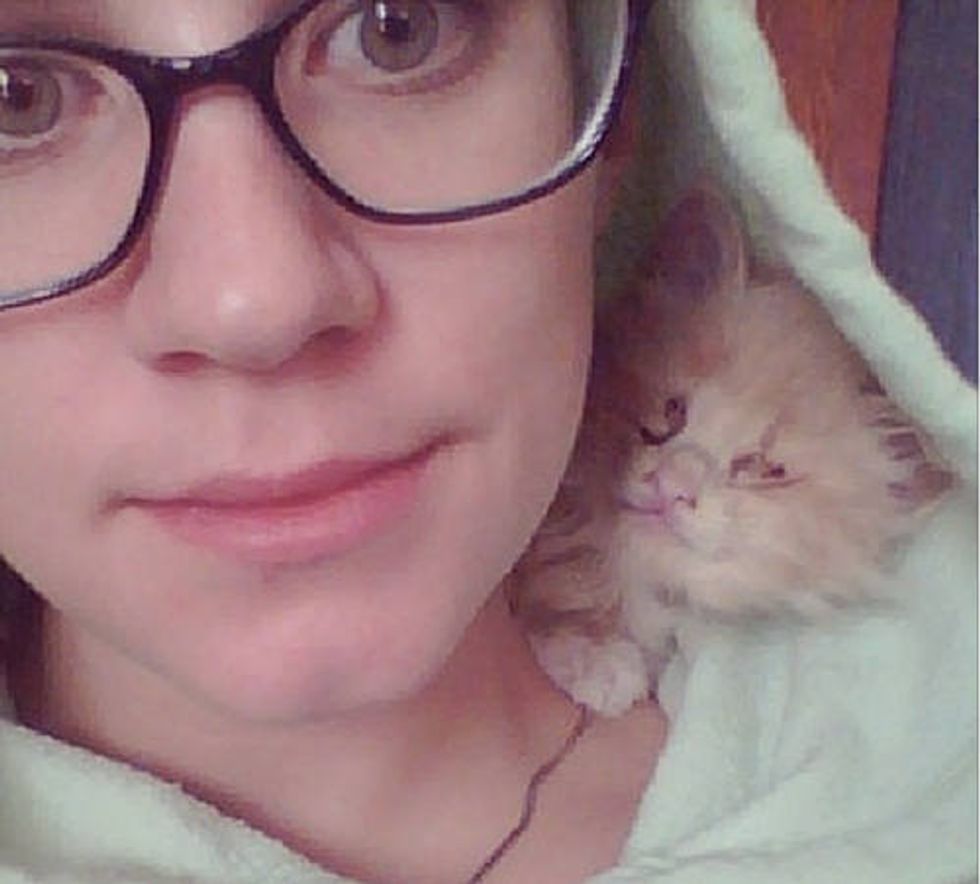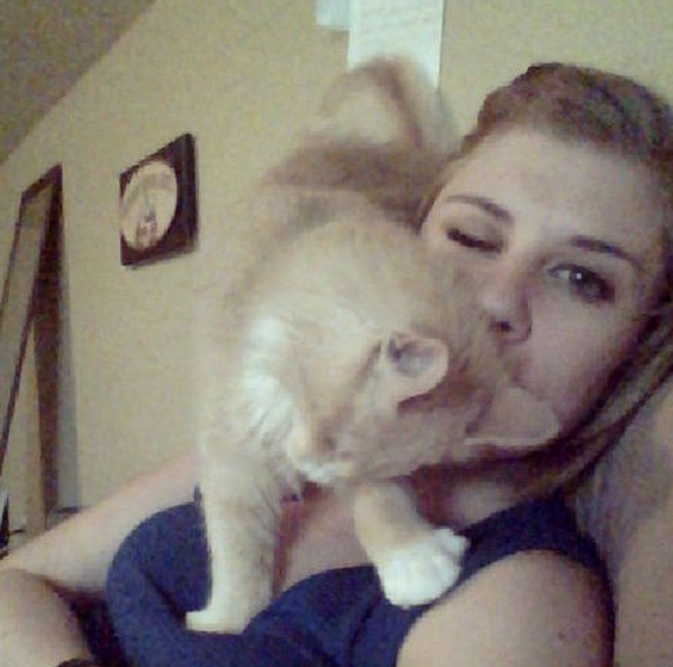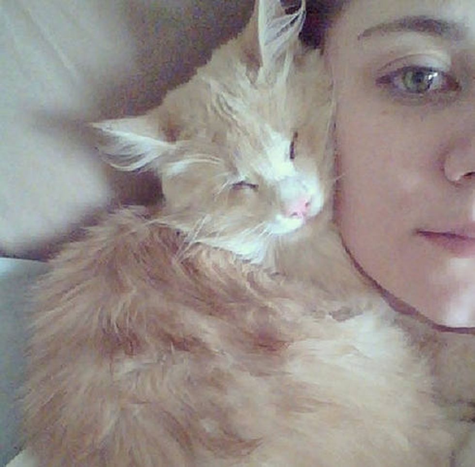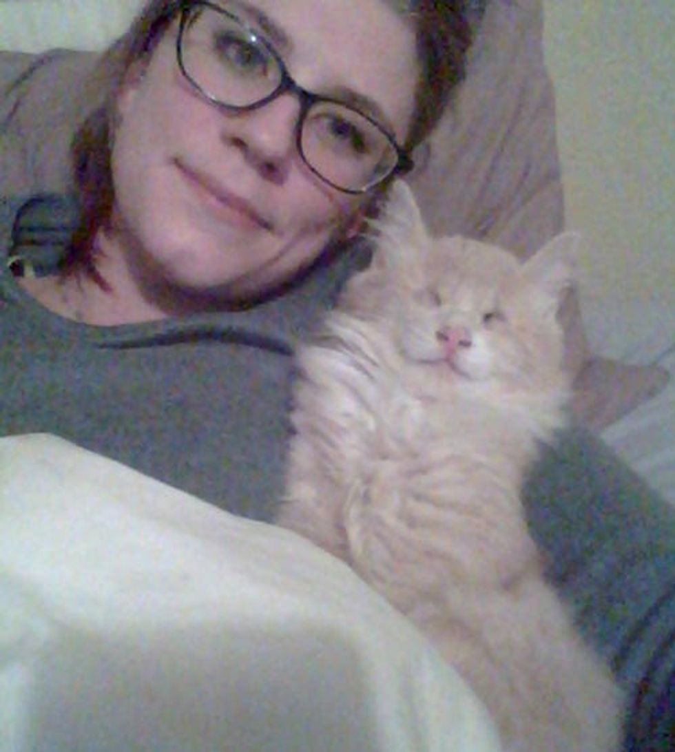 Blinkin the cat has no eyes, but he has found a person that he loves to snuggle with every day. "He was born of a barn cat and taken in by me when I found him separated from his mom and siblings, across the road, soaking wet and muddy… he had gotten lost," Allison wrote via her blog. "He was only about five weeks old at the time and should have stayed with his mother but I couldn’t risk him getting hit or eaten or just lost outside." She took him in and started raising him.