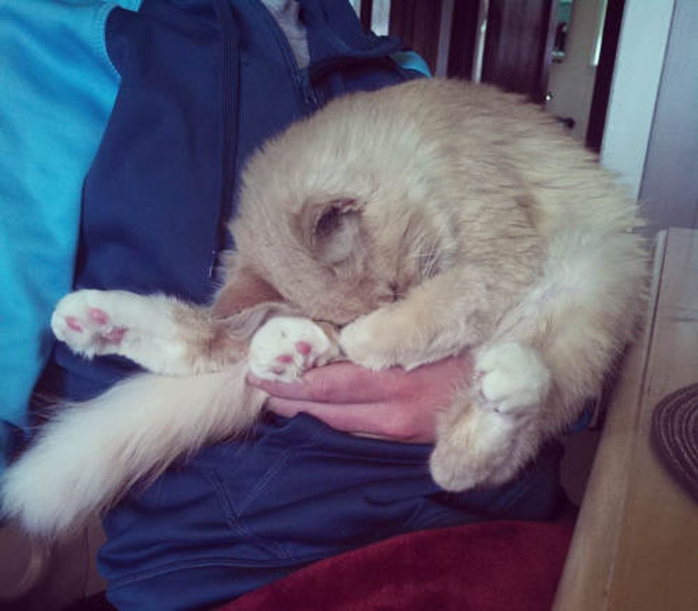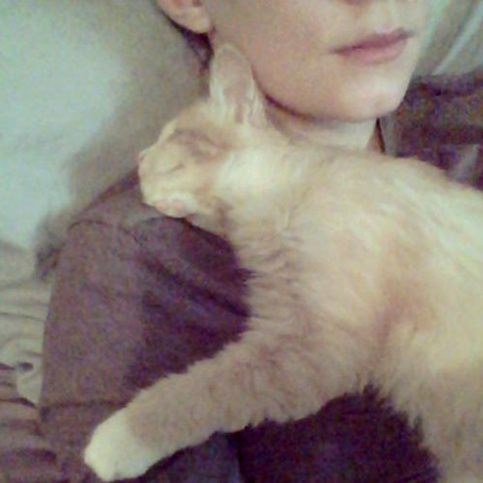 "Every day he makes sure to get as close to my face as he possibly can. Maybe he just feels safer when he is in someone’s arms, but most of the time he likes to be touching me somewhere - laying in my lap, around my head, over my neck, or on my shoulder - anywhere as long as he’s close."