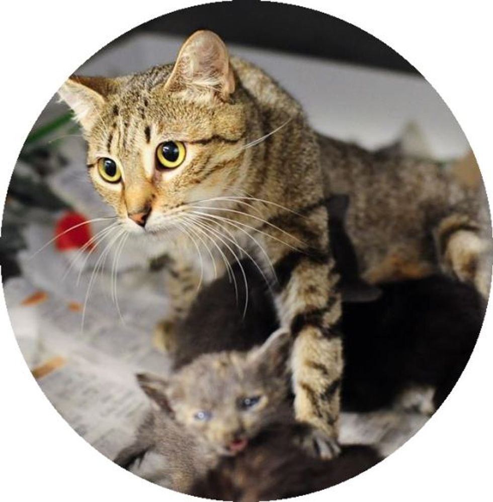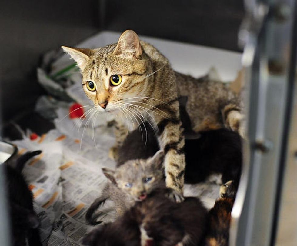 "This nursing mom came into the Pompano shelter without any babies. There was also a litter of kittens without a mom. The shelter paired them ltogether and now they are one happy little family. The kittens are very scrawny but hanging in there. We would love to get this newly formed family out [into a foster home] ASAP," said Good Karma Pet Rescue, a non-profit, no-kill rescue group in South Florida that takes in animals often deemed unwanted at other shelters.
