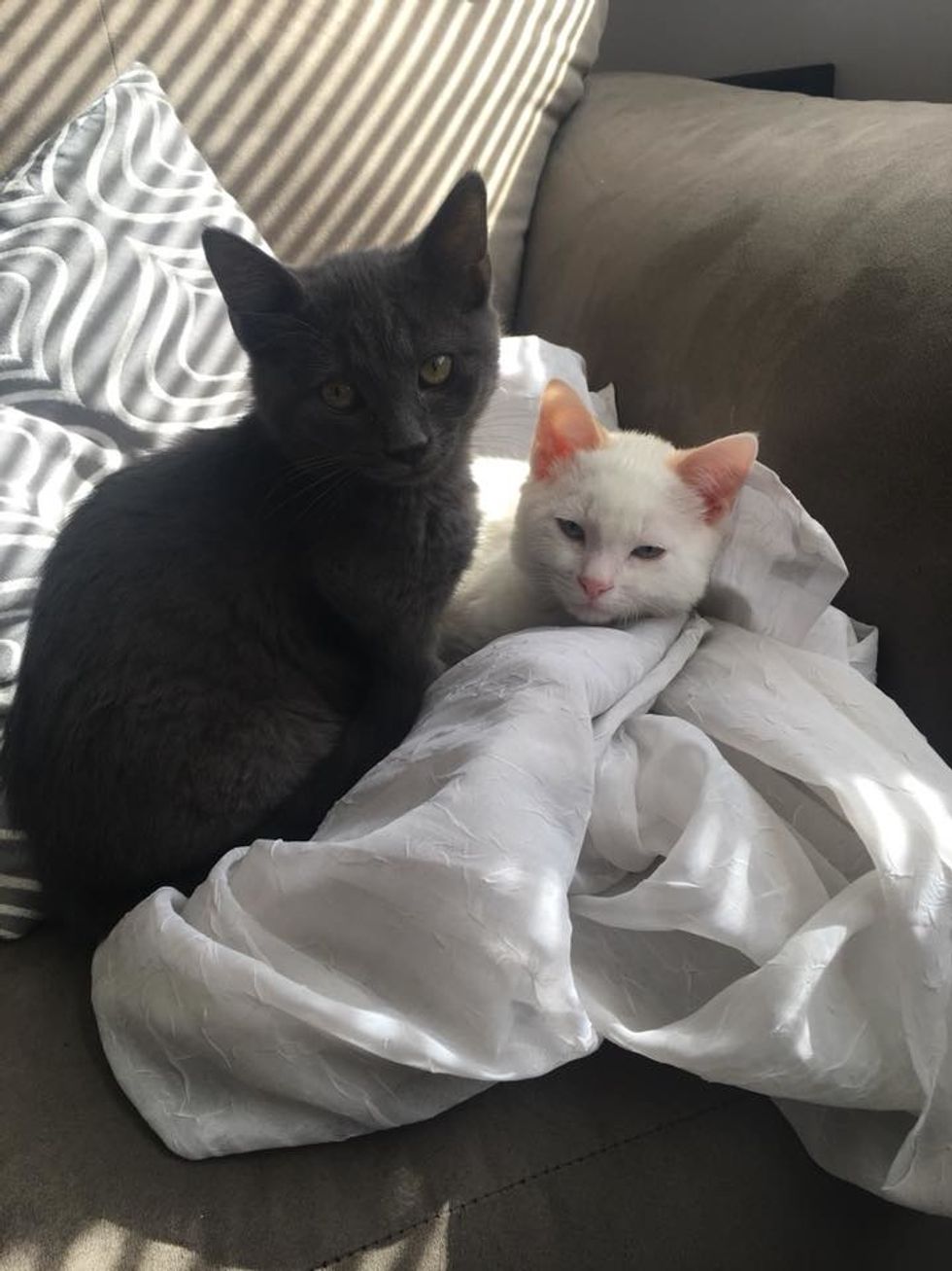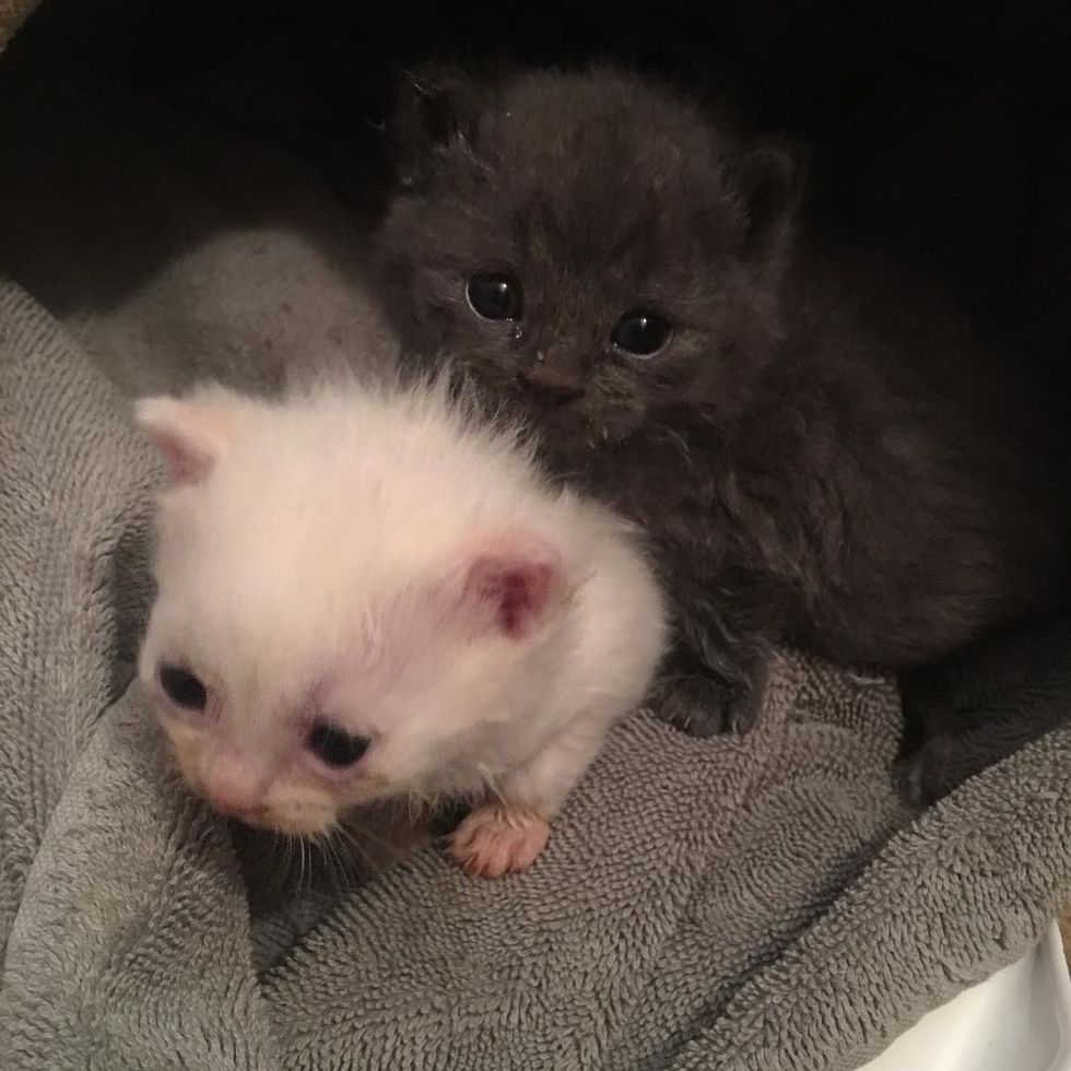 What they found was a tiny grey kitten lying on top of her listless brother. Karen put them in her shirt to warm them up as they were freezing cold and gave the weaker kitten (Whitey) sugar water to wake him up. It brought him back from the brink. "Whitey wasn't thriving at all and I had to make several ER visits with him."