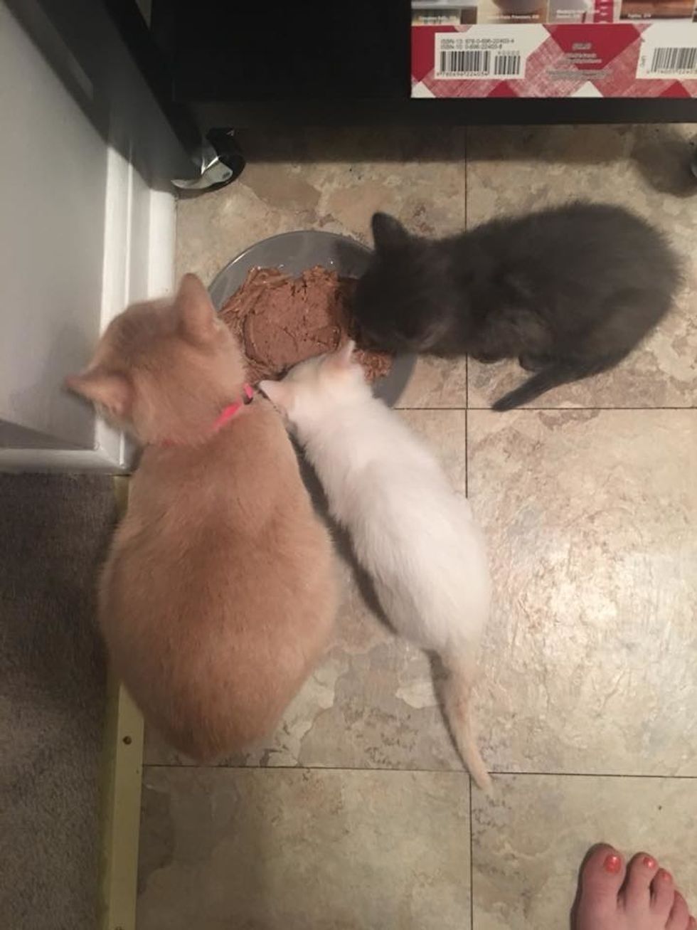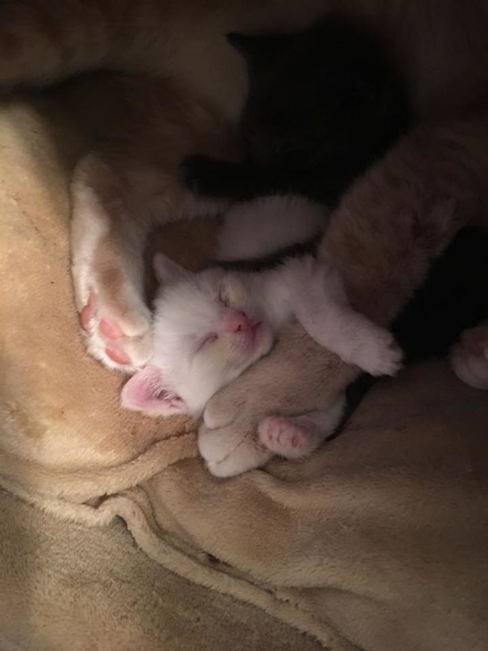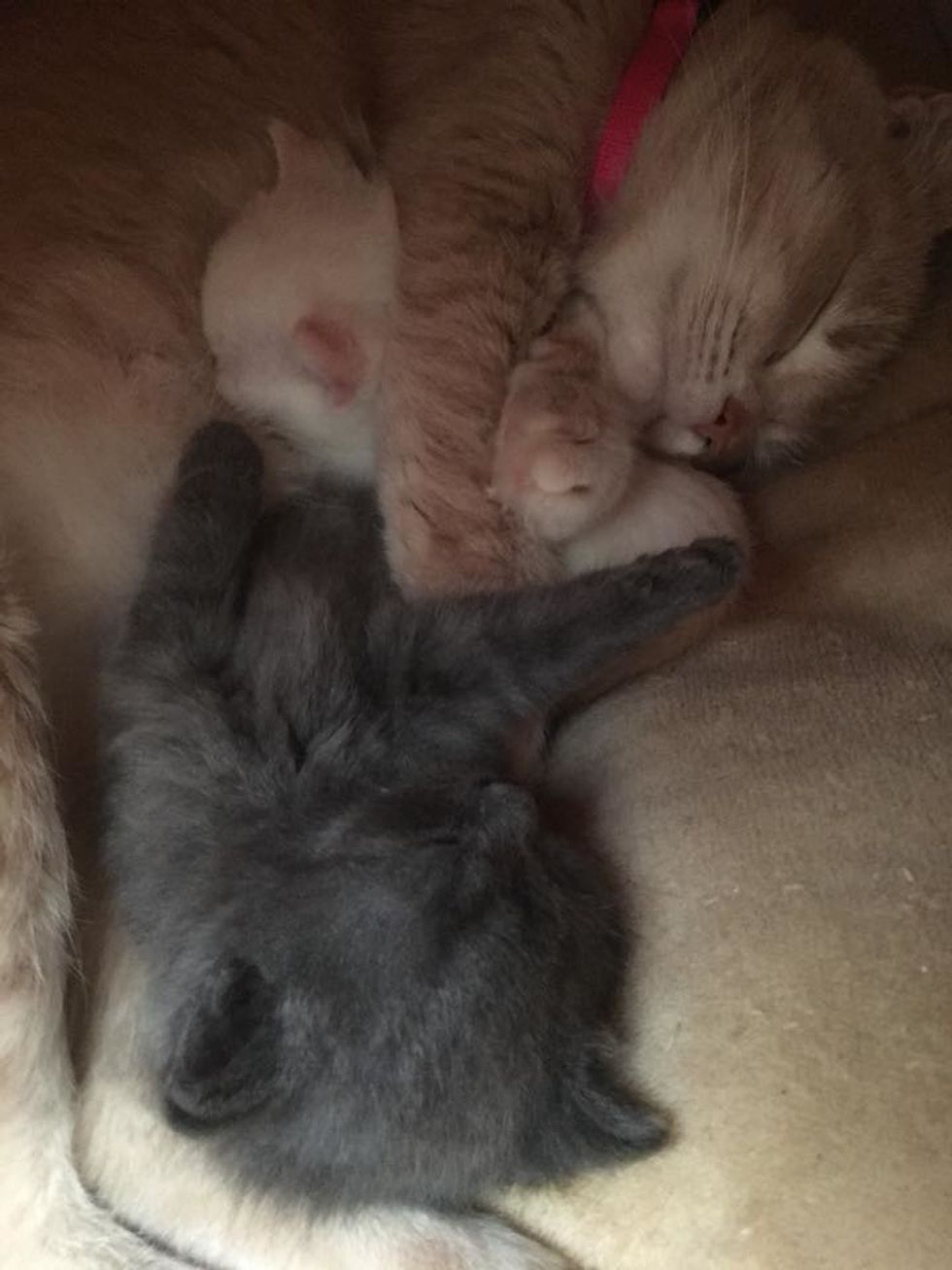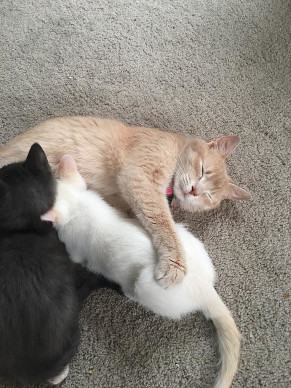 The kittens are thriving. They love clinging to their surrogate mom for that extra dose of TLC.