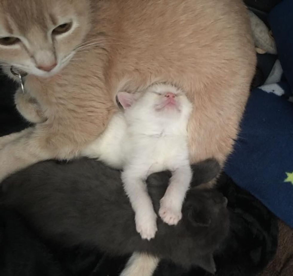 Meanwhile, a rescue stray cat, Nubby, was grieving over the loss of her kittens. The family that saved her from bitter cold, contacted Karen to see if they could let Mama Nubby care for the rescue kittens.