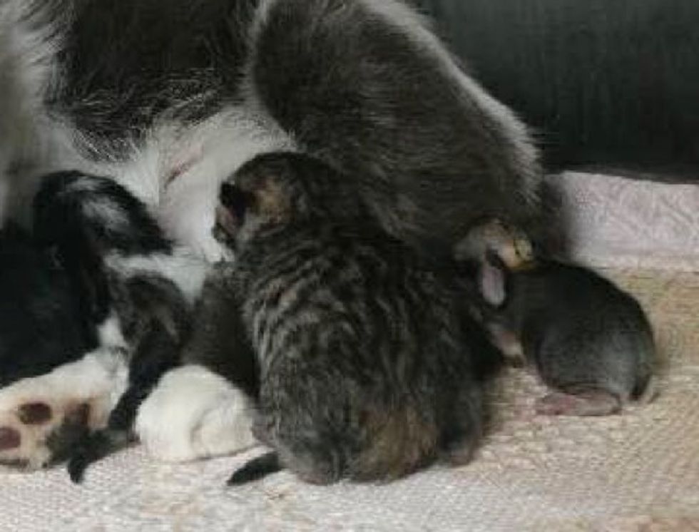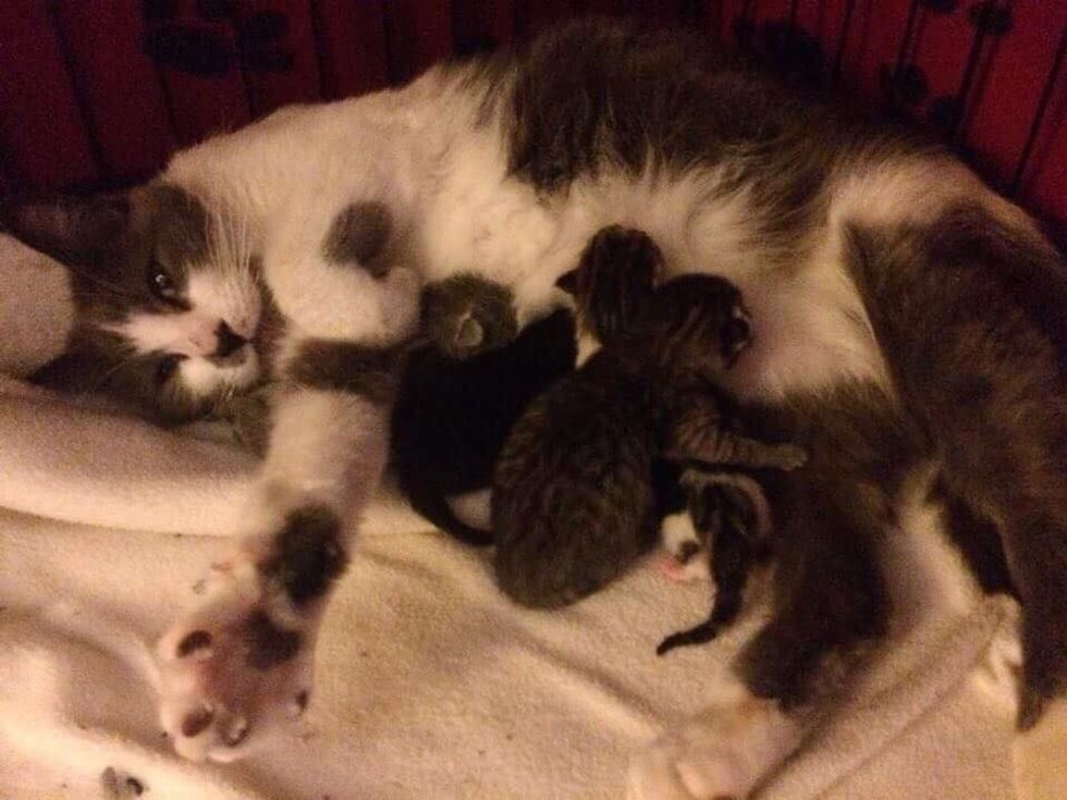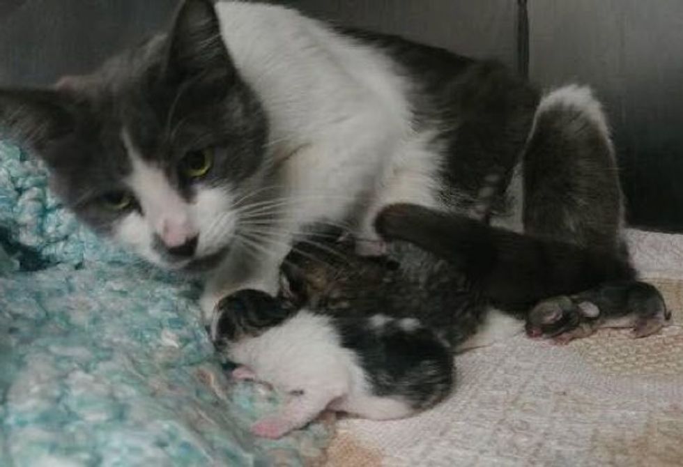 A pregnant cat was taken into a shelter in California a week ago. Soon after her arrival, she went into labor and gave birth to a litter of kittens.