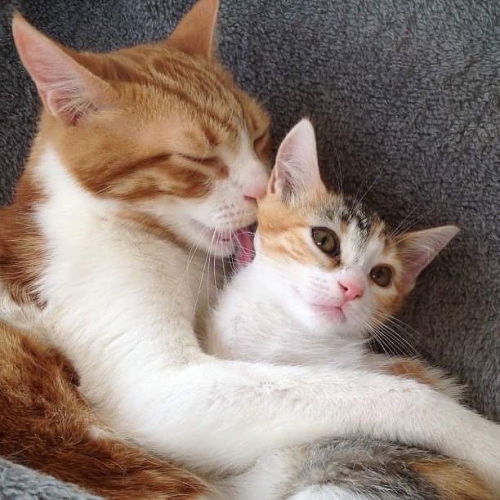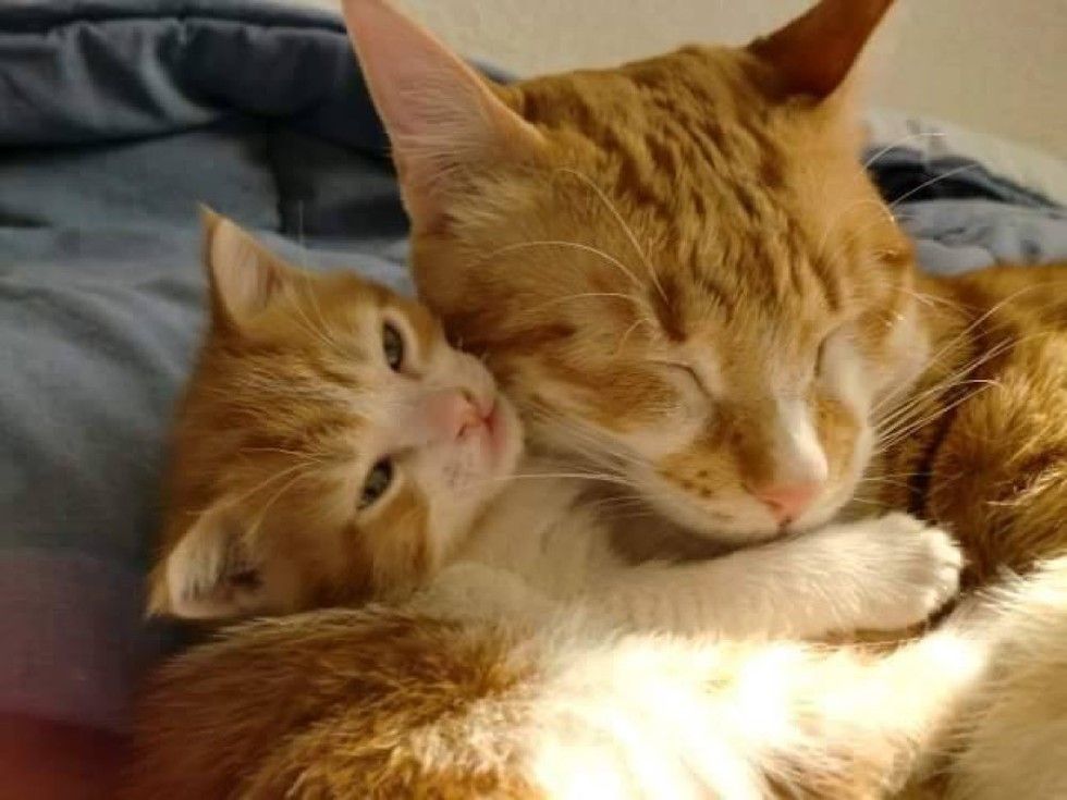 A tiny ginger boy who was born to a stray cat, didn't know what it was like to have a cat dad until another ginger cat took to him and started raising him like his own.