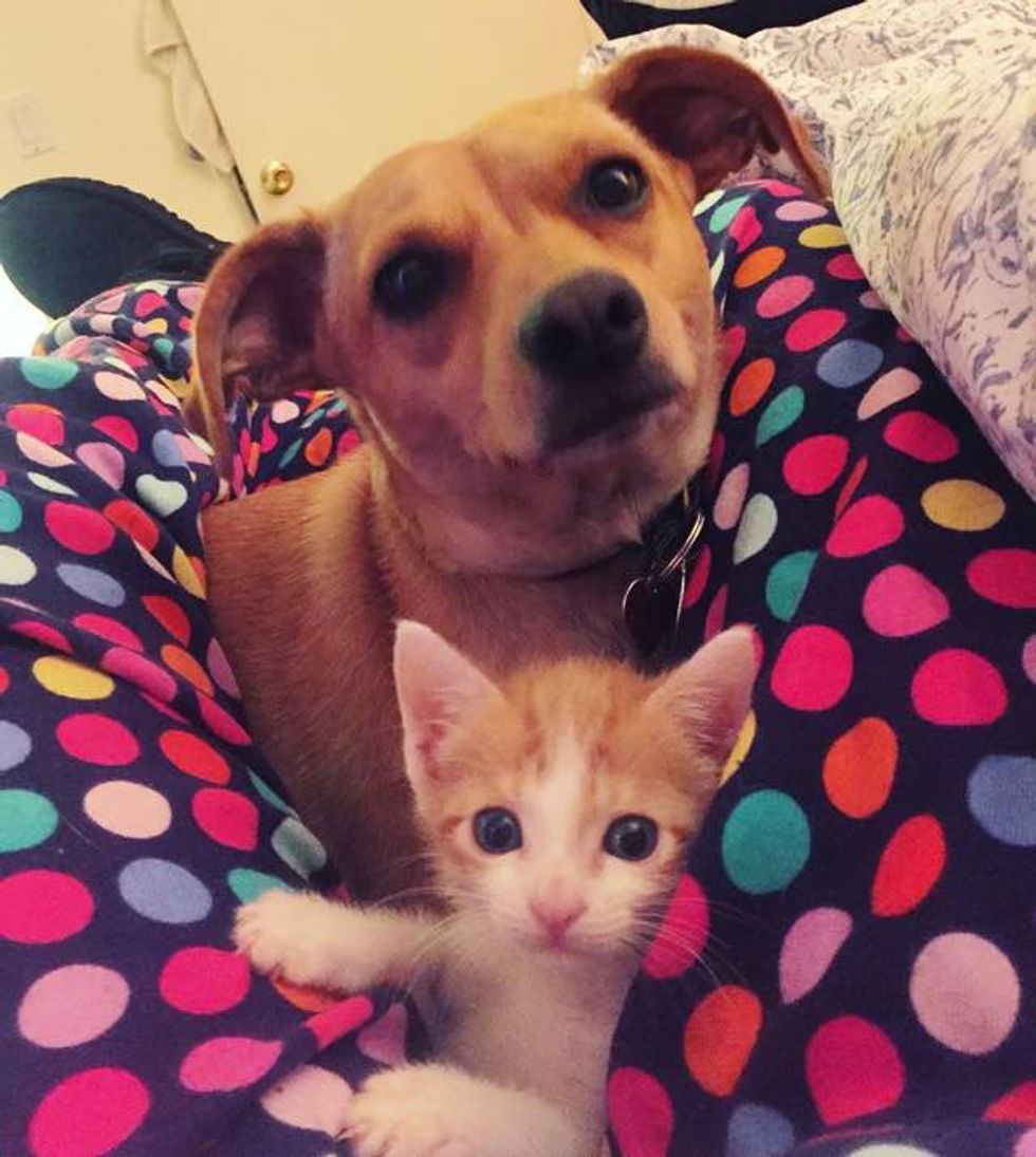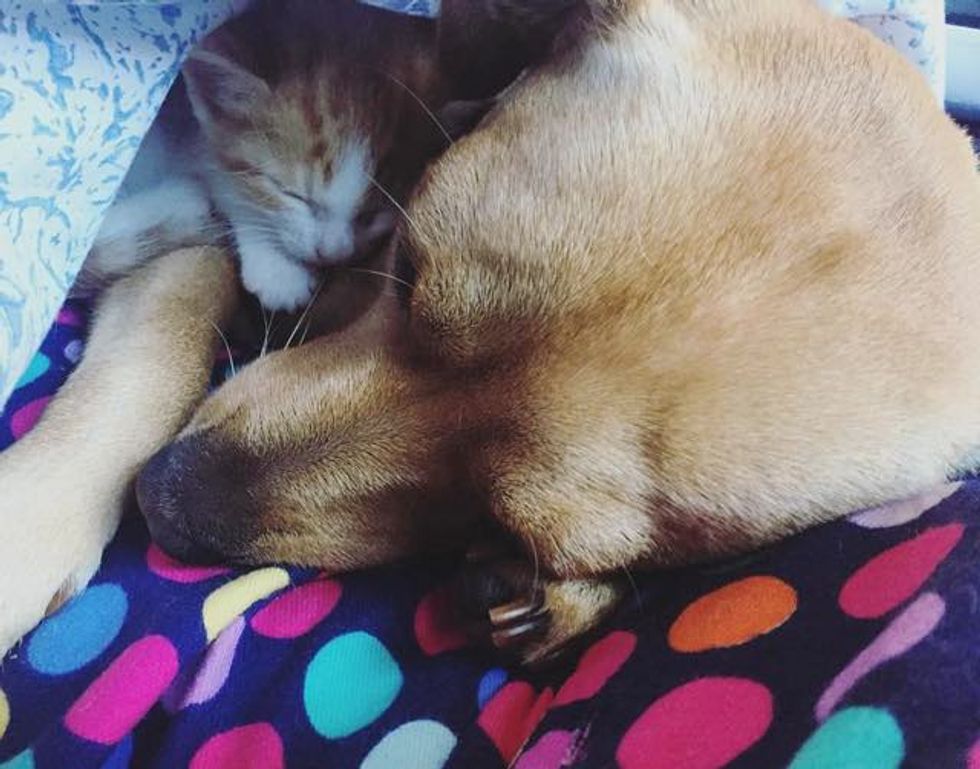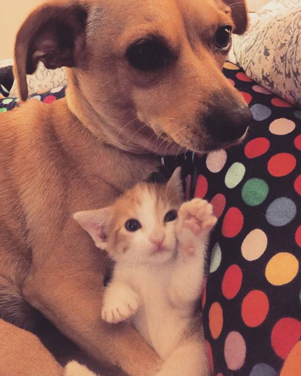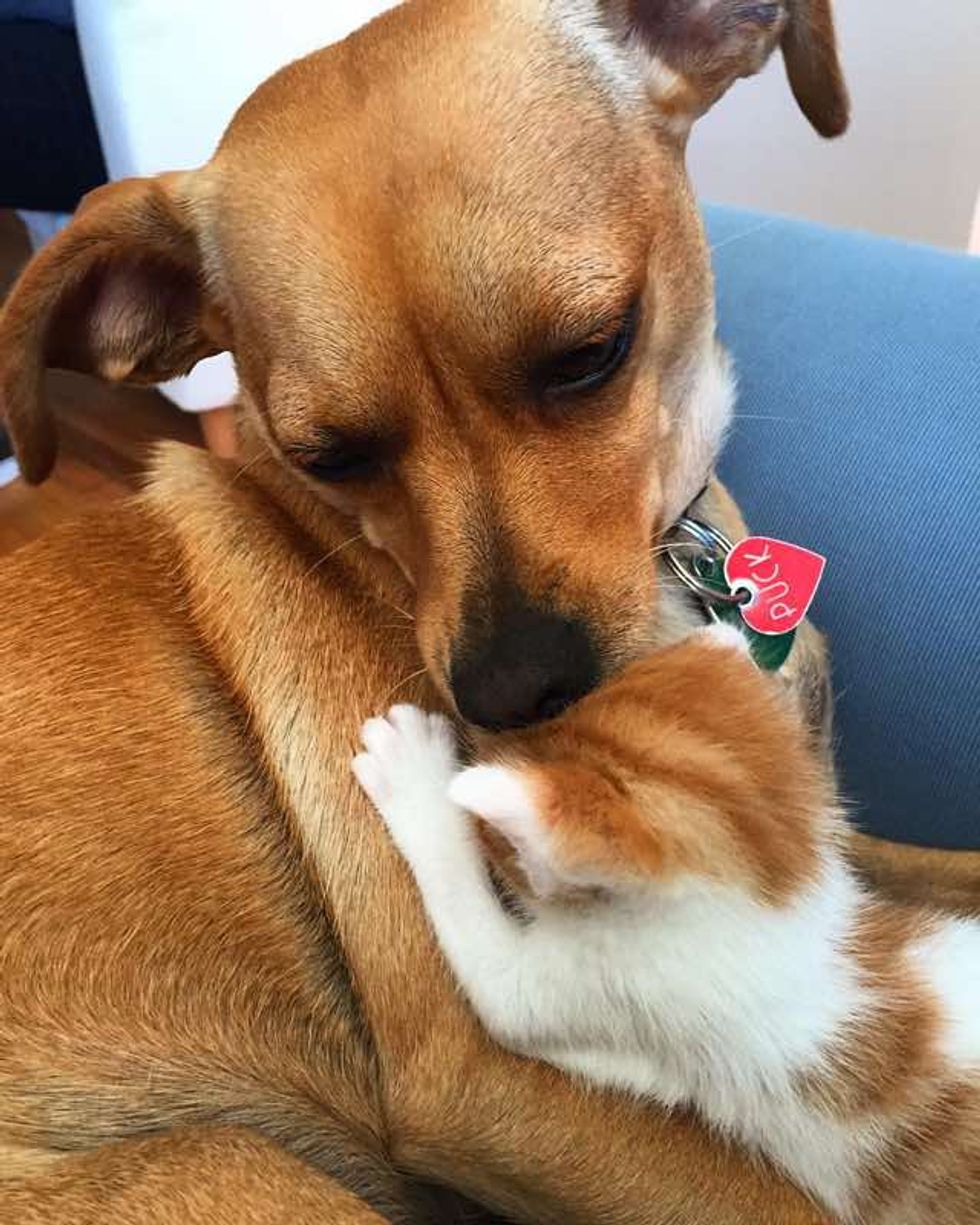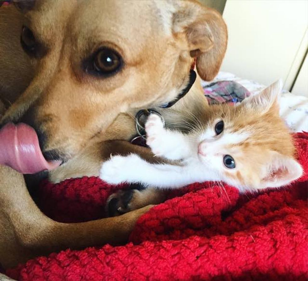 When Fitz the orphaned kitten came to his foster home, he was greeted by Puck the dog who is also a rescue herself. She took to the little ball of fluff and became his family.