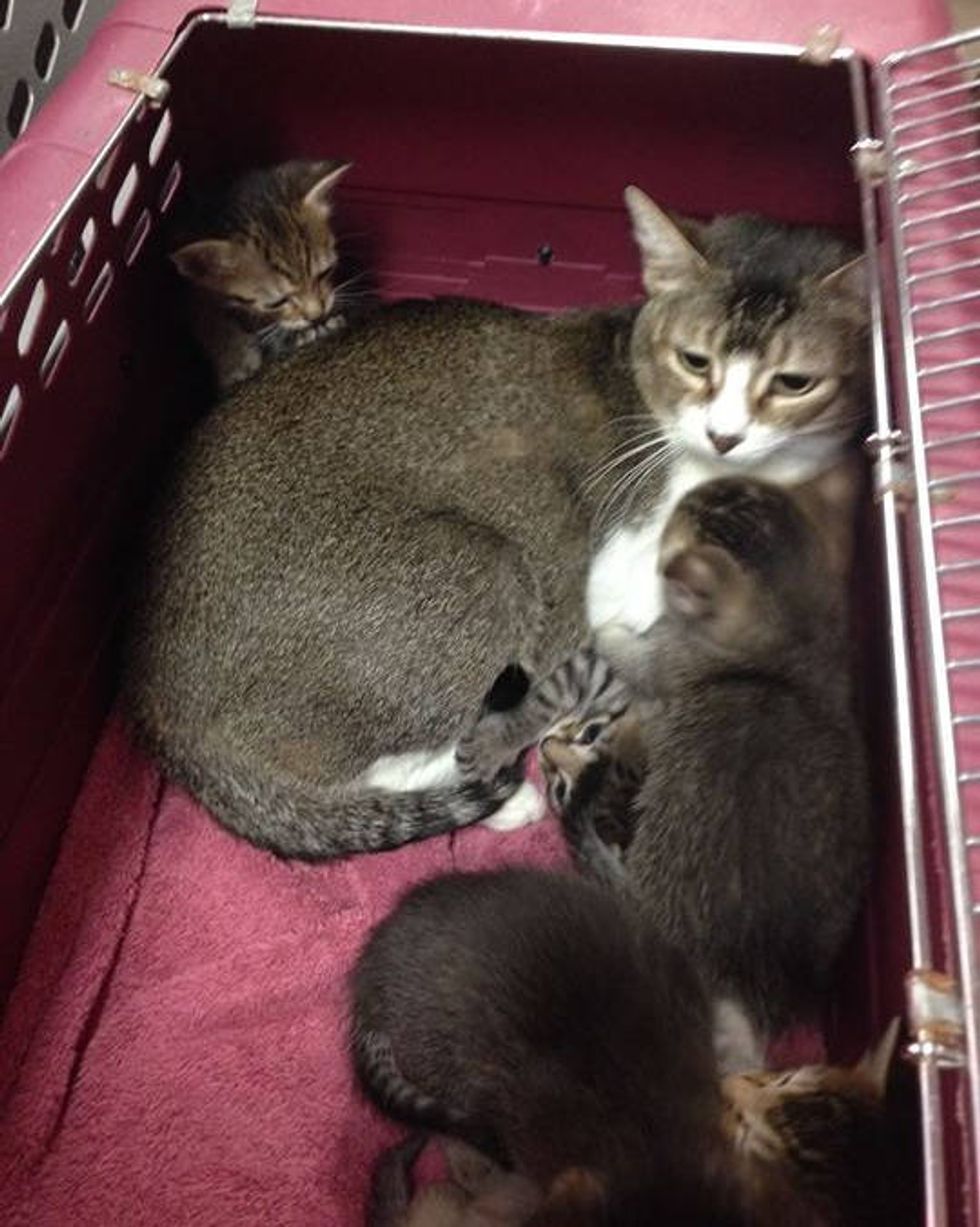 Momma stays by her kittens the whole time when they arrive at Tonis Kitty Rescue
