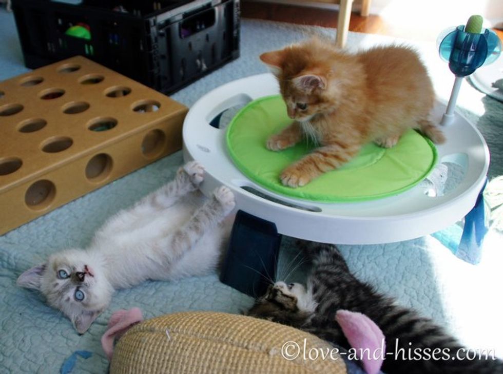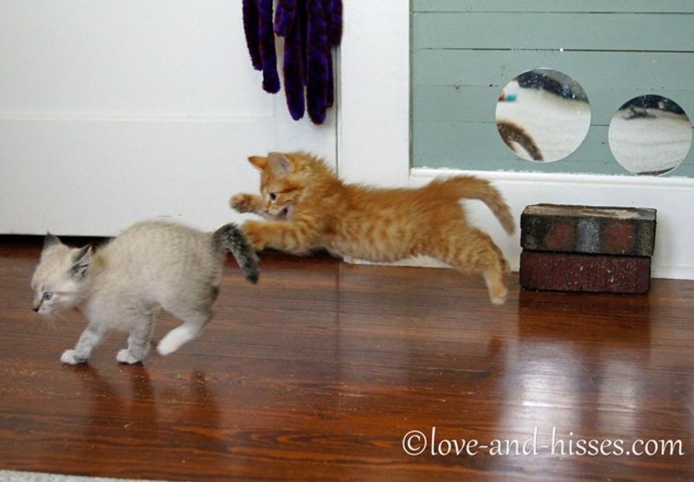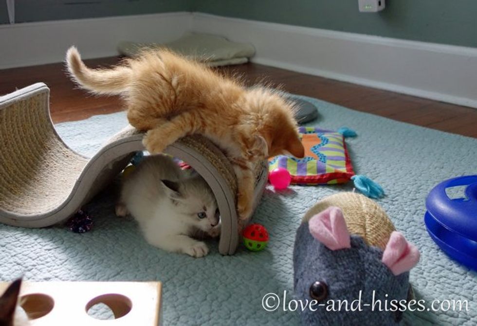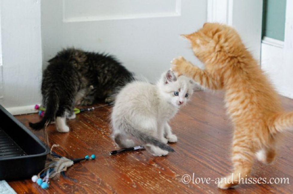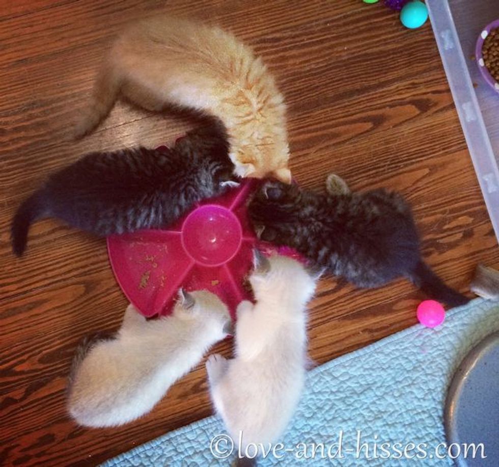 Now PW can't get enough of playtime with his new fur friends. "They’re sweet, friendly, extremely playful kittens, and after some initial hissiness between PW and the other four, they get along great and play together like crazy."