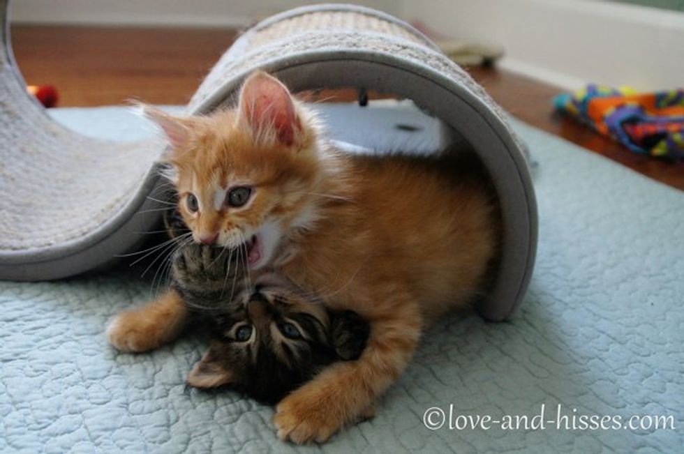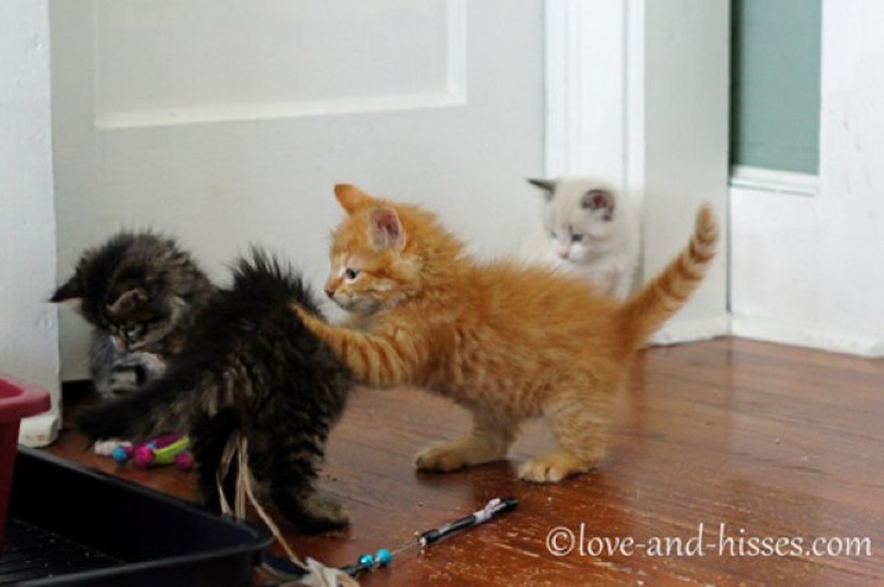 "PW was a singleton who’d been at the shelter for a few weeks, and desperately needed to be around other kittens his own age," said Robyn Anderson via Love and Hisses. "Ralph, Trader Joe, Von and Winn Dixie were a litter born at a vet’s office, and were about a week younger than PW."